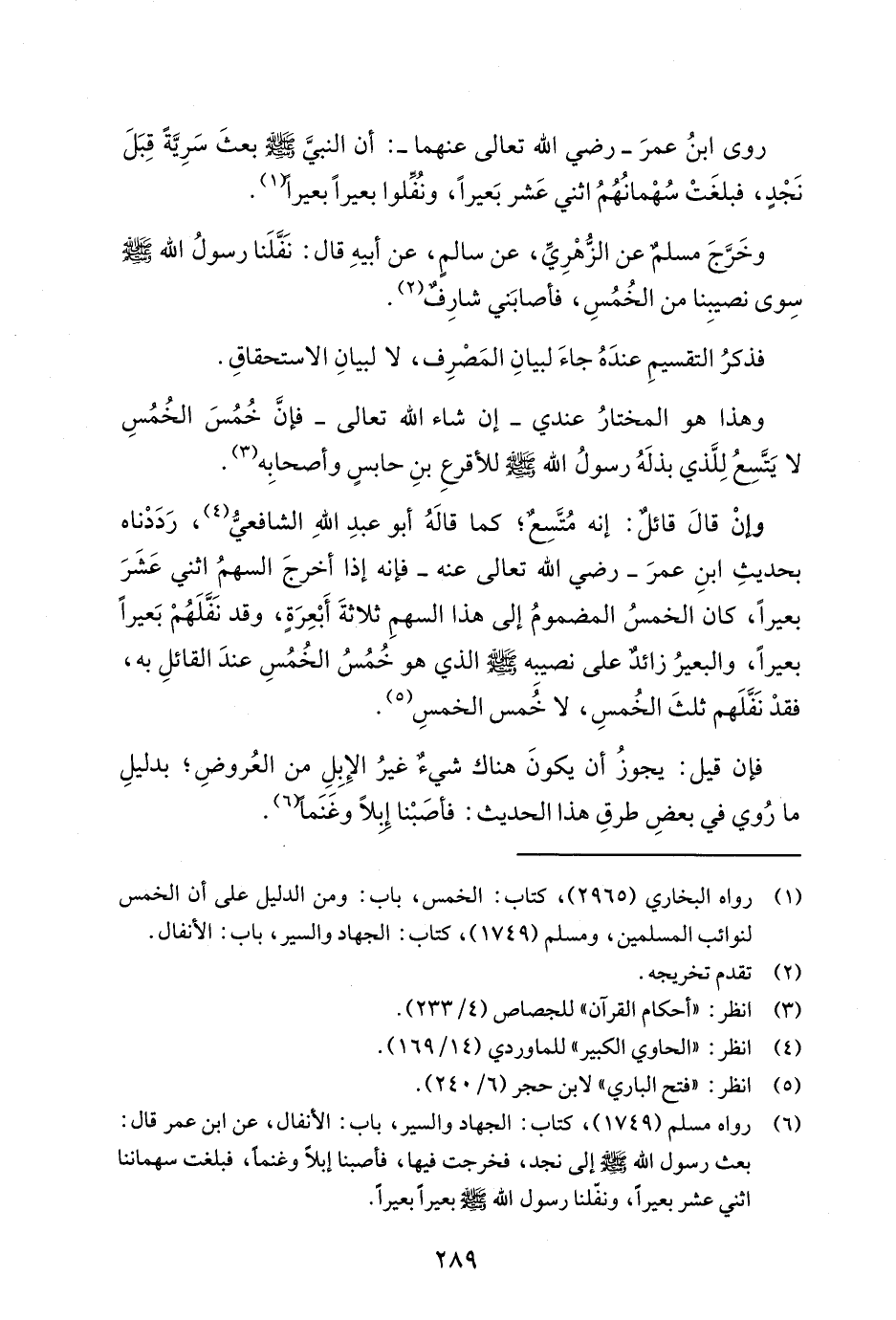 وإنْ قالَ قائلٌ: إنه مُتَّسِعٌ؛ كما قالَهُ أبو عبدِ اللهِ الشافعيُّ (¬4)، رَدَدْناه بحديثِ ابنِ عمرَ -رضي الله تعالى عنه- فإنه إذا أخرجَ السهمُ اثني عَشَرَ بعيراً، كان الخمسُ المضمومُ إلى هذا السهمِ ثلاثةَ أَبْعِرَةٍ، وقد نَفَّلَهُمْ بَعيراً بعيراً، والبعيرُ زائدٌ على نصيبه - صلى الله عليه وسلم - الذي هو خُمُسُ الخُمُسِ عندَ القائلِ به، فقدْ نَفَّلَهم ثلثَ الخُمسِ، لا خُمس الخمسِ (¬5).