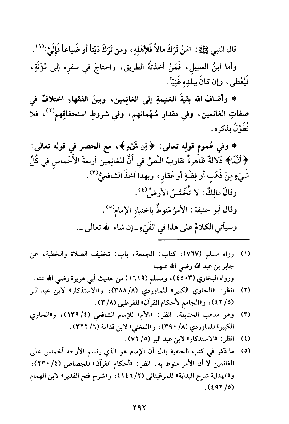 * وأضافَ الله بقيةَ الغنيمةِ إلى الغانِمين، وبينَ الفقهاءِ اختلافٌ في صفاتِ الغانمين، وفي مقدارِ سُهْمانهم، وفي شروطِ استحقاقِهم (¬2)، فلا نُطَوِّلُ بذكره.