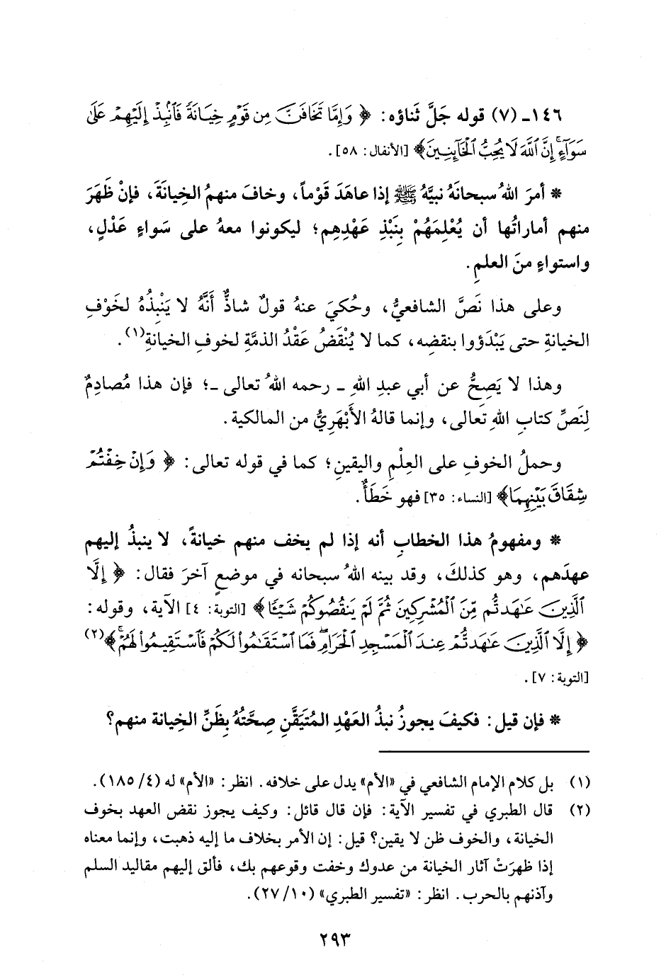 146 - (7) قوله جَلَّ ثَناؤه: {وَإِمَّا تَخَافَنَّ مِنْ قَوْمٍ خِيَانَةً فَانْبِذْ إِلَيْهِمْ عَلَى سَوَاءٍ إِنَّ اللَّهَ لَا يُحِبُّ الْخَائِنِينَ} [الأنفال: 58].