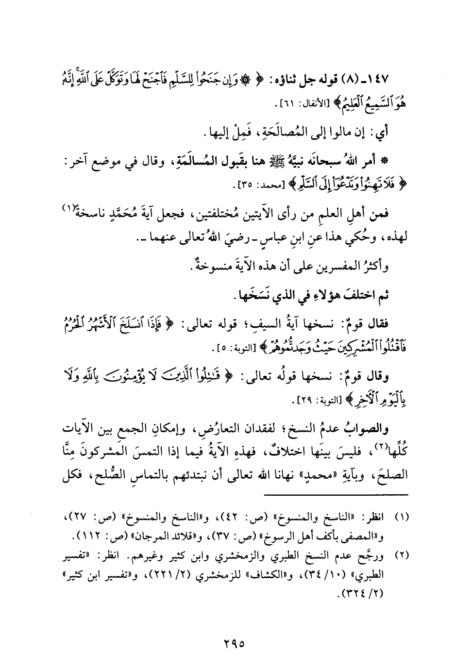 والصوابُ عدمُ النسخ؛ لفقدان التعارُضِ، وإمكانِ الجمعِ بين الآيات كُلِّها (¬2)، فليسَ بينَها اختلافٌ، فهذهِ الآيةُ فيما إذا التمسَ المشركونَ مِنَّا الصلحَ، وبآيةِ "محمدٍ" نهانا الله تعالى أن نبتدئهم بالتماسِ الصُّلح، فكل