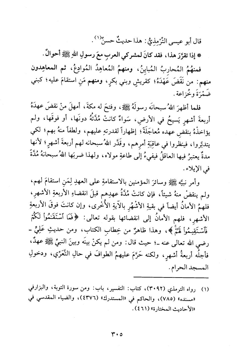 وأمر نبيَّه - صلى الله عليه وسلم - وسائرَ المؤمنين بالاستقامةِ على العهدِ لِمَنِ استقامَ لهم، ولم ينقضْ منهُ شيئاً، فإن كانتْ مُدَّةُ عهدِهم قبلَ انقضاءِ الأربعةِ الأشهرِ، فلهمُ الأمانُ أيضاً في بقيةِ الأشْهُرِ بالآيةِ الأُخْرى، وإن كانتَ فوقَ الأربعةِ الأشهرِ، فلهم الأمانُ إلى انقضائها بقوله تعالى: {فَمَا اسْتَقَامُوا لَكُمْ فَاسْتَقِيمُوا لَهُمْ}، وهذا ظاهرٌ من خِطابِ الكتاب، ومن حديثِ عَلِيٍّ -رضي الله تعالى عنه-؛ حيث قال: ومن لم يكنْ بينَه وبينَ النبيِّ - صلى الله عليه وسلم - عهدٌ، فأجلُه أربعةُ أشهرٍ، ولكنه حَرَّمَ عليهمُ الطوافَ في حالِ التَّعَرِّي، ودخولِ المسجد الحرام.