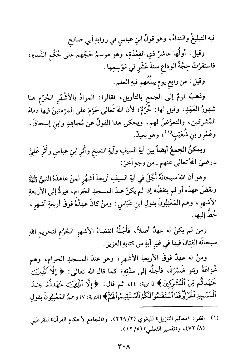 وذهبَ قومٌ إلى الجمعِ بالتأويل، فقالوا: المرادُ بالأشْهُرِ الحُرُمِ هنا شهورُ العَهْدِ، وقيل لها: حُرُمٌ؛ لأن اللهَ تَعالى حَرَّمَ على المؤمنينَ فيها دماءَ المُشركين، والتعرُّضَ لهم، ويحكى هذا القولُ عن مُجاهِدٍ وابنِ إسحاقَ، وعَمْرِو بنِ شُعَيْبٍ (¬1)، وهو بعيدٌ.