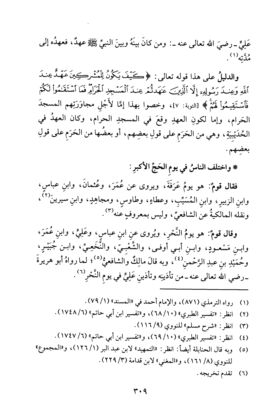 وقال قومٌ: هو يومُ النَّحْرِ، ويُروى عنِ ابنِ عباسٍ، وعَلِيٍّ، وابنِ عُمَرَ، وابنِ مَسْعودٍ، وابنِ أبي أوفى، والشَّعْبيّ، والنَّخَعِيِّ، وابن جُبَيْرٍ، وحُمَيْدِ بنِ عبدِ الرَّحْمنِ (¬4)، وبه قالَ مالِكٌ وَالشافعيُّ (¬5)؛ لما رواهُ أبو هريرةَ -رضي الله تعالى عنه- من تأذينِه وتأذينِ عَلِيٍّ في يومِ النَّحْرِ (¬6).