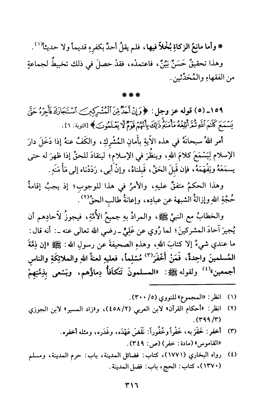 159 - (5) قوله عز وجل: {وَإِنْ أَحَدٌ مِنَ الْمُشْرِكِينَ اسْتَجَارَكَ فَأَجِرْهُ حَتَّى يَسْمَعَ كَلَامَ اللَّهِ ثُمَّ أَبْلِغْهُ مَأْمَنَهُ ذَلِكَ بِأَنَّهُمْ قَوْمٌ لَا يَعْلَمُونَ} [التوبة: 6].