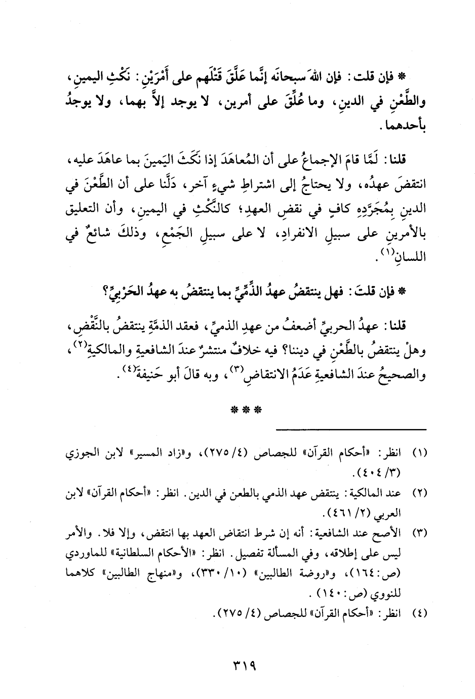 قلنا: لَمَّا قامَ الإجماعُ على أن المُعاهَدَ إذا نَكَثَ اليَمينَ بما عاهَدَ عليه، انتقضَ عهدُه، ولا يحتاجُ إلى اشتراطِ شيءٍ آخر، دَلَّنا على أن الطَّعْنَ في الدينِ بِمُجَرَّدِهِ كافٍ في نقضِ العهدِ؛ كالنَّكْثِ في اليمينِ، وأن التعليق بالأمرينِ على سبيلِ الانفرادِ، لا على سبيلِ الجَمْعِ، وذلكَ شائعٌ في اللسانِ (¬1).