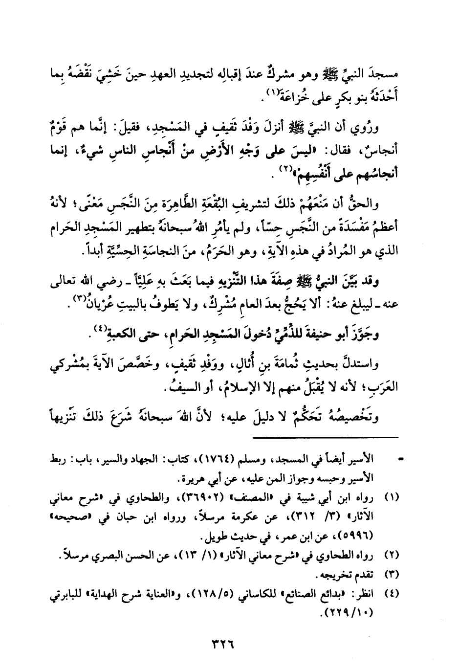 ورُوي أن النبيَّ - صلى الله عليه وسلم - أنزلَ وَفْدَ ثَقيفٍ في المَسْجِدِ، فقيلَ: إنَّما هم قَوْمٌ أنجاسٌ، فقال: "ليسَ على وَجْهِ الأَرْضِ منْ أَنْجاسِ الناسِ شيءٌ, إنما أنجاسُهم على أَنْفُسِهِمْ" (¬2).