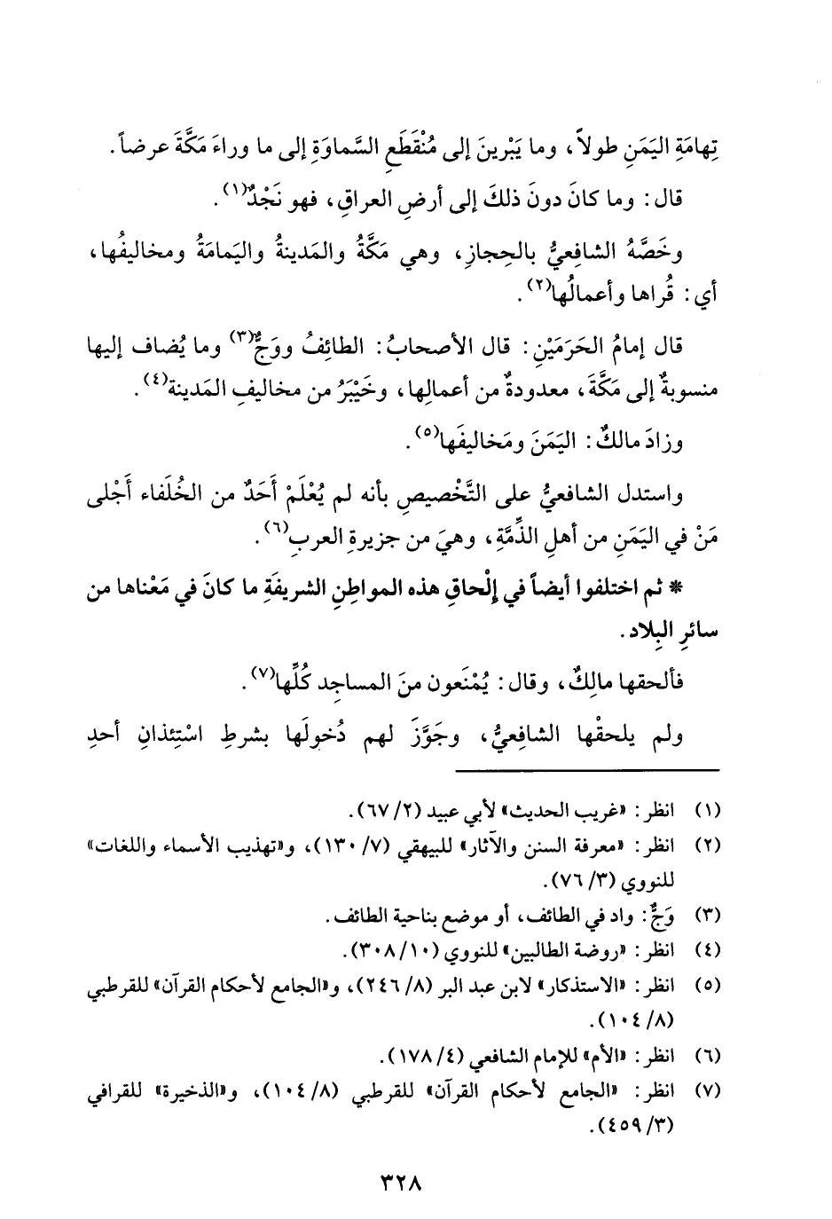 * ثم اختلفوا أيضًا في إلْحاقِ هذه المواطِنِ الشريفَةِ ما كانَ في مَعْناها من سائرِ البِلاد.