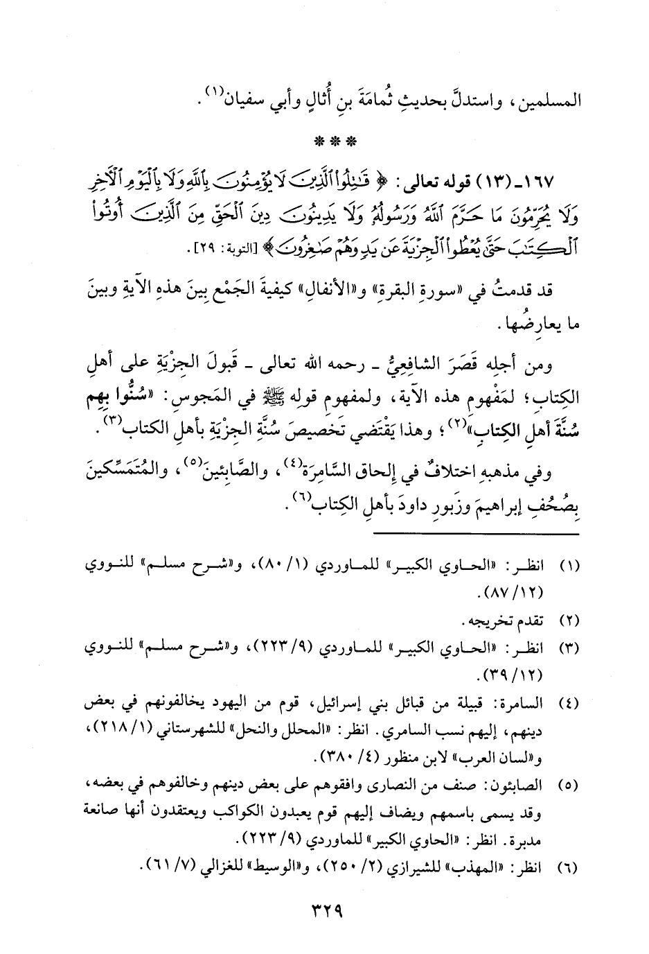 167 - (13) قوله تعالى: {قَاتِلُوا الَّذِينَ لَا يُؤْمِنُونَ بِاللَّهِ وَلَا بِالْيَوْمِ الْآخِرِ وَلَا يُحَرِّمُونَ مَا حَرَّمَ اللَّهُ وَرَسُولُهُ وَلَا يَدِينُونَ دِينَ الْحَقِّ مِنَ الَّذِينَ أُوتُوا الْكِتَابَ حَتَّى يُعْطُوا الْجِزْيَةَ عَنْ يَدٍ وَهُمْ صَاغِرُونَ} [التوبة: 29].
