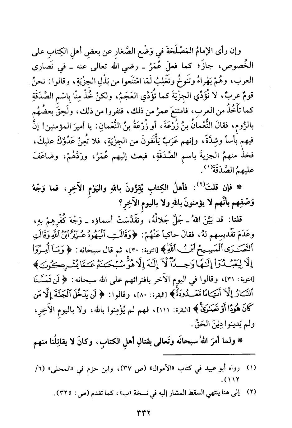 وإن رأى الإمامُ المَصْلَحَةَ في وَضْع الصَّغارِ عن بعضِ أهلِ الكِتابِ على الخُصوص، جازَ؛ كما فعلَ عُمَرُ -رضي الله تعالى عنه- في نَصارى العرب، وهُمْ بَهْراءُ وتنَوخُ وَتغْلِبُ لَمّا امْتَنَعوا من بَذْلِ الجِزْيَةِ، وقالوا: نحنُ قومٌ عربٌ، لا نُؤَدِّي الجِزْيَةَ كما تُؤَدَّي العَجَمُ، ولكنْ خُذْ مِنّا بِاسْمِ الصَّدَقَةِ كما تَأْخُذُ من العربِ، فامتنعَ عمرُ من ذلك، فنفروا من ذلك، ولَحِقَ بعضُهُم بالرُّومِ، فقالَ النُّعْمانُ بنُ زُرْعَةَ، أو زُرْعَةُ بنُ النُّعْمانِ: يا أميرَ المؤمنين! إنَّ فيهم بأسًا وشِدَّةً، وإنهم عَرَبٌ يَأنَفونَ من الجِزْيَةِ، فلا تُعِنْ عَدُوَّكَ عليكَ، فخذ منهمُ الجزيةَ باسمِ الصَّدَقَةِ، فبعث إليهم عُمَرُ، ورَدَّهُمْ، وضاعَفَ عليهمُ الصَّدَقَةَ (¬1).
