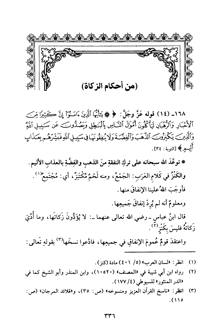 168 - (14) قوله عَزَ وجَلَّ: {يَاأَيُّهَا الَّذِينَ آمَنُوا إِنَّ كَثِيرًا مِنَ الْأَحْبَارِ وَالرُّهْبَانِ لَيَأْكُلُونَ أَمْوَالَ النَّاسِ بِالْبَاطِلِ وَيَصُدُّونَ عَنْ سَبِيلِ اللَّهِ وَالَّذِينَ يَكْنِزُونَ الذَّهَبَ وَالْفِضَّةَ وَلَا يُنْفِقُونَهَا فِي سَبِيلِ اللَّهِ فَبَشِّرْهُمْ بِعَذَابٍ أَلِيمٍ} [التوبة: 34].