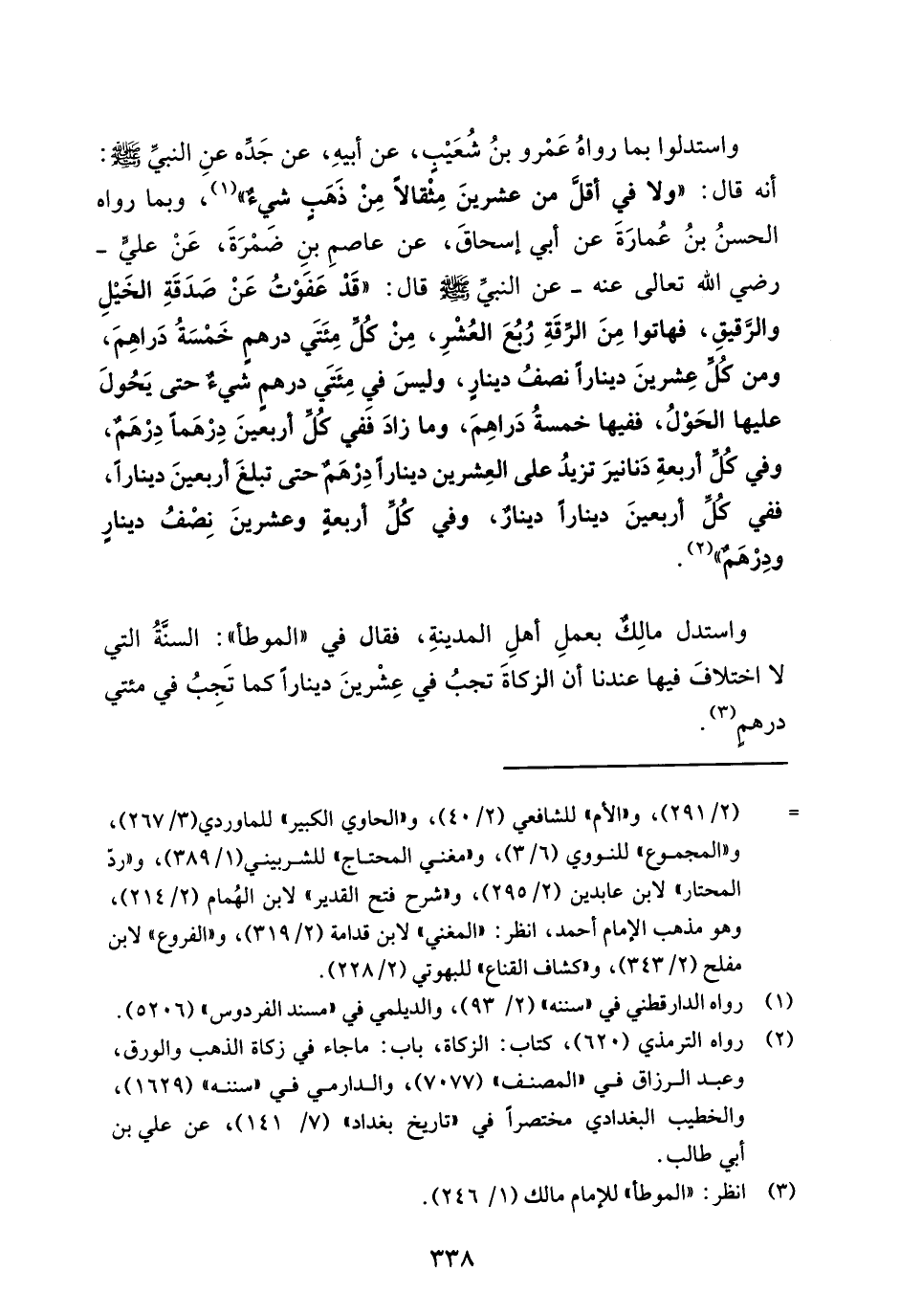واستدلوا بما رواهُ عَمْرو بنُ شُعَيْبِ، عن أبيهِ، عن جَذه عنِ النبيِّ - صلى الله عليه وسلم -: أنه قال: "ولا في أقلَّ من عشرينَ مِثْقالًا مِنْ ذَهَبٍ شيِءٌ" (¬1)، وبما رواه الحسنُ بنُ عُمارَةَ عن أبي إسحاقَ، عن عاصمِ بنِ ضمْرَةَ، عَنْ علىٍّ -رضي الله تعالى عنه- عن النبي - صلى الله عليه وسلم - قال: "قَدْ عَفَوْتُ عَنْ صَدَقَةِ الخَيْلِ والرَّقيقِ، فهاتوا مِنَ الرِّقَةِ رُبُعَ العُشْرِ، مِنْ كُلِّ مِئَتَي درهمٍ خَمْسَةُ دَراهِمَ، ومن كُلِّ عِشرينَ دينارًا نصفُ دينارٍ، وليسَ فيِ مِئَتَي درهمٍ شيءٌ حتى يَحُولَ عليها الحَوْلُ، ففيها خمسةُ دَراهِمَ، وما زادَ فَفي كُلِّ أربعينَ دِرْهَمًا دِرْهَمٌ، وفي كُلِّ أربعةِ دَنانيرَ تزيدُ على العِشرين دينارًا دِرْهَمٌ حتى تبلغَ أربعينَ دينارًا، ففي كُلِّ أربعينَ دينارًا دينارٌ، وفي كُلٍّ أربعةٍ وعشرينَ نِصْفُ دينارٍ ودِرْهَمٌ" (¬2).