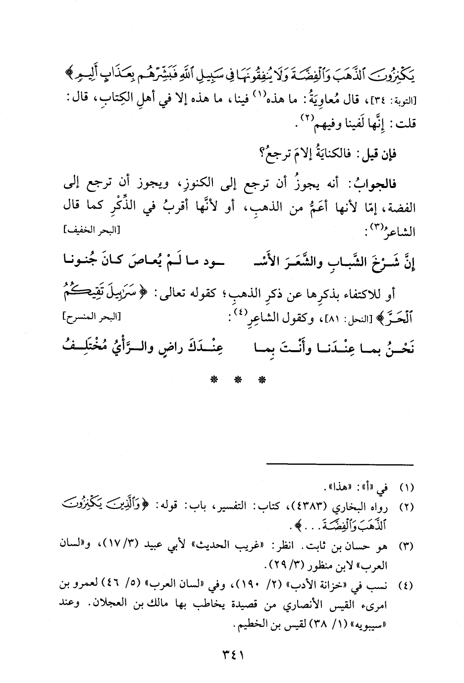 فالجوابُ: أنه يجوزُ أن ترجع إلى الكنوزِ، ويجوز أن ترجع إلى الفضة، إمّا لأنها أعَمُّ من الذهبِ، أو لأنَّها أقربُ في الذِّكْرِ كما قال الشاعرُ (¬3): [البحر الخفيف]