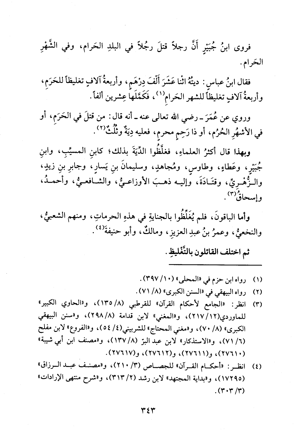 وبهذا قال أكثرُ العلماءِ، فغلَّظُوا الدِّيَةَ بذلك؛ كابنِ المسيَّبِ، وابنِ جُبَيْرٍ، وعَطاءٍ، وطاوسٍ، ومُجاهدٍ، وسليمانَ بنِ يَسارٍ، وجابرِ بنِ زيدٍ، والزُّهْرِيِّ، وقتَادَةَ، وإليه ذهبَ الأوزاعيُّ، والشافعيُّ، وأحمدُ، وإسحاقُ (¬3).