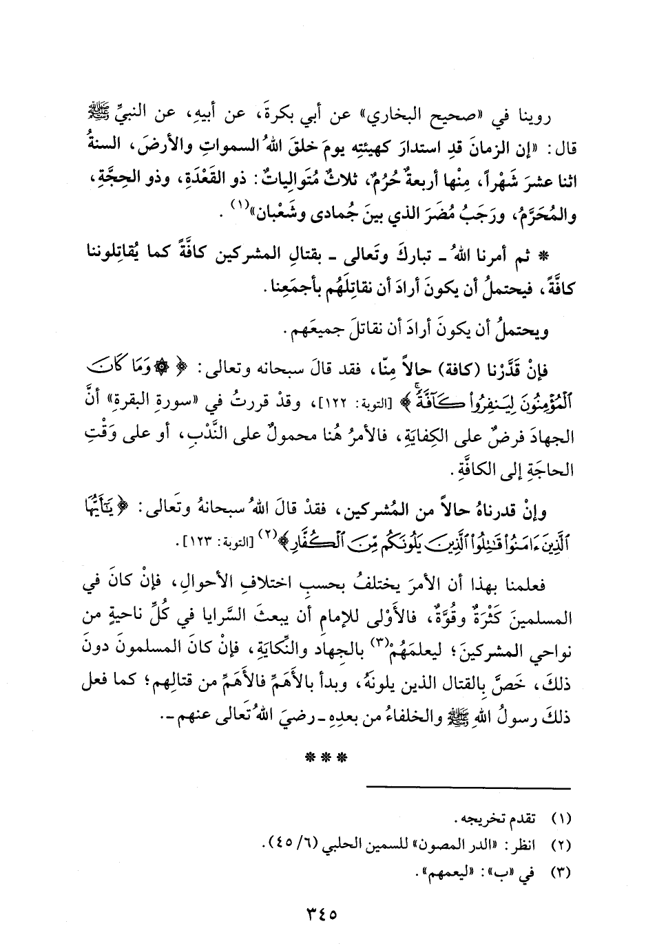 فعلمنا بهذا أن الأمرَ يختلفُ بحسب اختلافِ الأحوالِ، فإنْ كانَ في المسلمينَ كَثْرَةٌ وقُوَّةٌ، فالأَوْلى للإمامِ أَن يبعثَ السَّرايا في كُلِّ ناحيةٍ من نواحي المشركينَ؛ ليعلمَهُمْ (¬3) بالجِهاد والنِّكايَةِ، فإنْ كانَ المسلمونَ دونَ ذلكَ، خَصَّ بِالقتال الذين يلونَهُ، وبدأ بالأَهَمِّ فالأَهَمِّ من قتالِهم؛ كما فعل ذلكَ رسولُ اللهِ - صلى الله عليه وسلم - والخلفاءُ من بعدِهِ -رضيَ اللهُ تَعالى عنهم-.