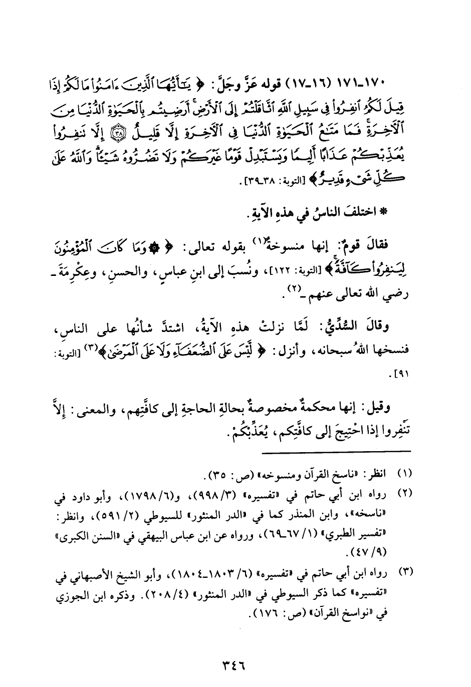 170 - 171 (16 - 17) قوله عَزَّ وجَلَّ: {يَاأَيُّهَا الَّذِينَ آمَنُوا مَا لَكُمْ إِذَا قِيلَ لَكُمُ انْفِرُوا فِي سَبِيلِ اللَّهِ اثَّاقَلْتُمْ إِلَى الْأَرْضِ أَرَضِيتُمْ بِالْحَيَاةِ الدُّنْيَا مِنَ الْآخِرَةِ فَمَا مَتَاعُ الْحَيَاةِ الدُّنْيَا فِي الْآخِرَةِ إِلَّا قَلِيلٌ (38) إِلَّا تَنْفِرُوا يُعَذِّبْكُمْ عَذَابًا أَلِيمًا وَيَسْتَبْدِلْ قَوْمًا غَيْرَكُمْ وَلَا تَضُرُّوهُ شَيْئًا وَاللَّهُ عَلَى كُلِّ شَيْءٍ قَدِيرٌ} [التوبة: 38 - 39].