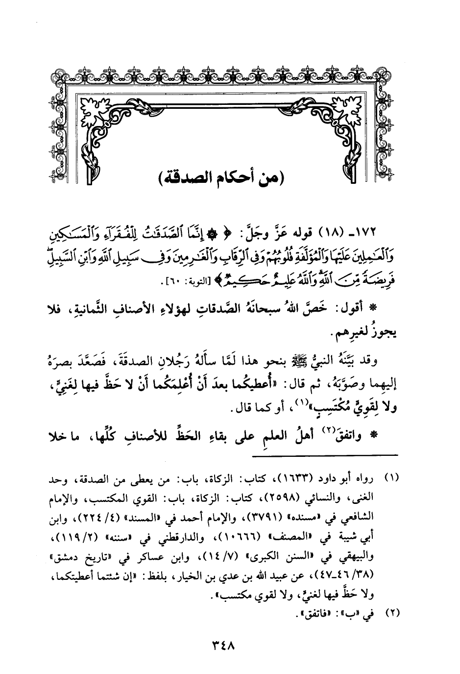 172 - (18) قوله عَزَّ وجَل: {إِنَّمَا الصَّدَقَاتُ لِلْفُقَرَاءِ وَالْمَسَاكِينِ وَالْعَامِلِينَ عَلَيْهَا وَالْمُؤَلَّفَةِ قُلُوبُهُمْ وَفِي الرِّقَابِ وَالْغَارِمِينَ وَفِي سَبِيلِ اللَّهِ وَابْنِ السَّبِيلِ فَرِيضَةً مِنَ اللَّهِ وَاللَّهُ عَلِيمٌ حَكِيمٌ} [التوبة: 60].