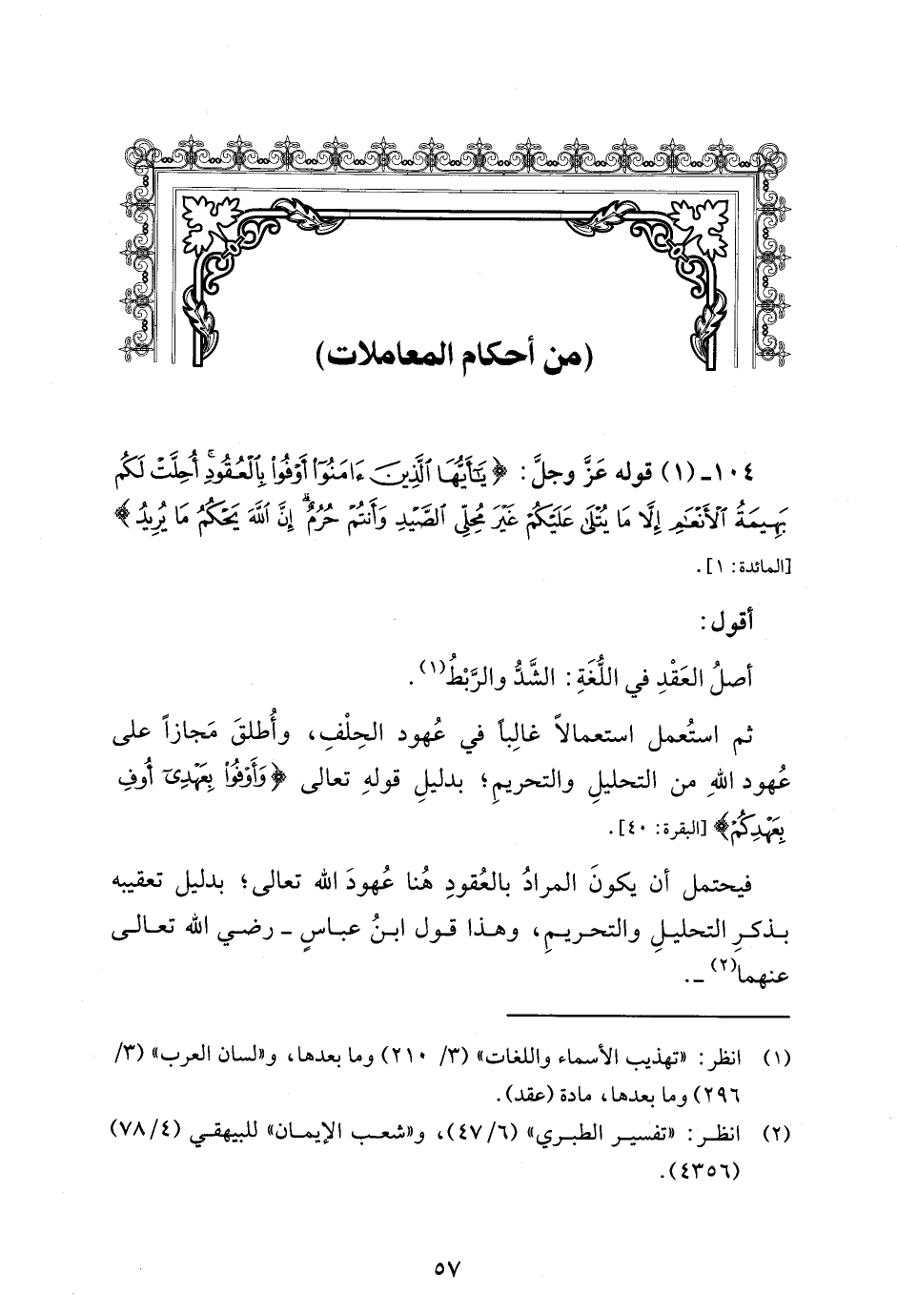 104 - (1) قوله عَزَّ وجلَّ: {يَاأَيُّهَا الَّذِينَ آمَنُوا أَوْفُوا بِالْعُقُودِ أُحِلَّتْ لَكُمْ بَهِيمَةُ الْأَنْعَامِ إِلَّا مَا يُتْلَى عَلَيْكُمْ غَيْرَ مُحِلِّي الصَّيْدِ وَأَنْتُمْ حُرُمٌ إِنَّ اللَّهَ يَحْكُمُ مَا يُرِيدُ} [المائدة: 1].