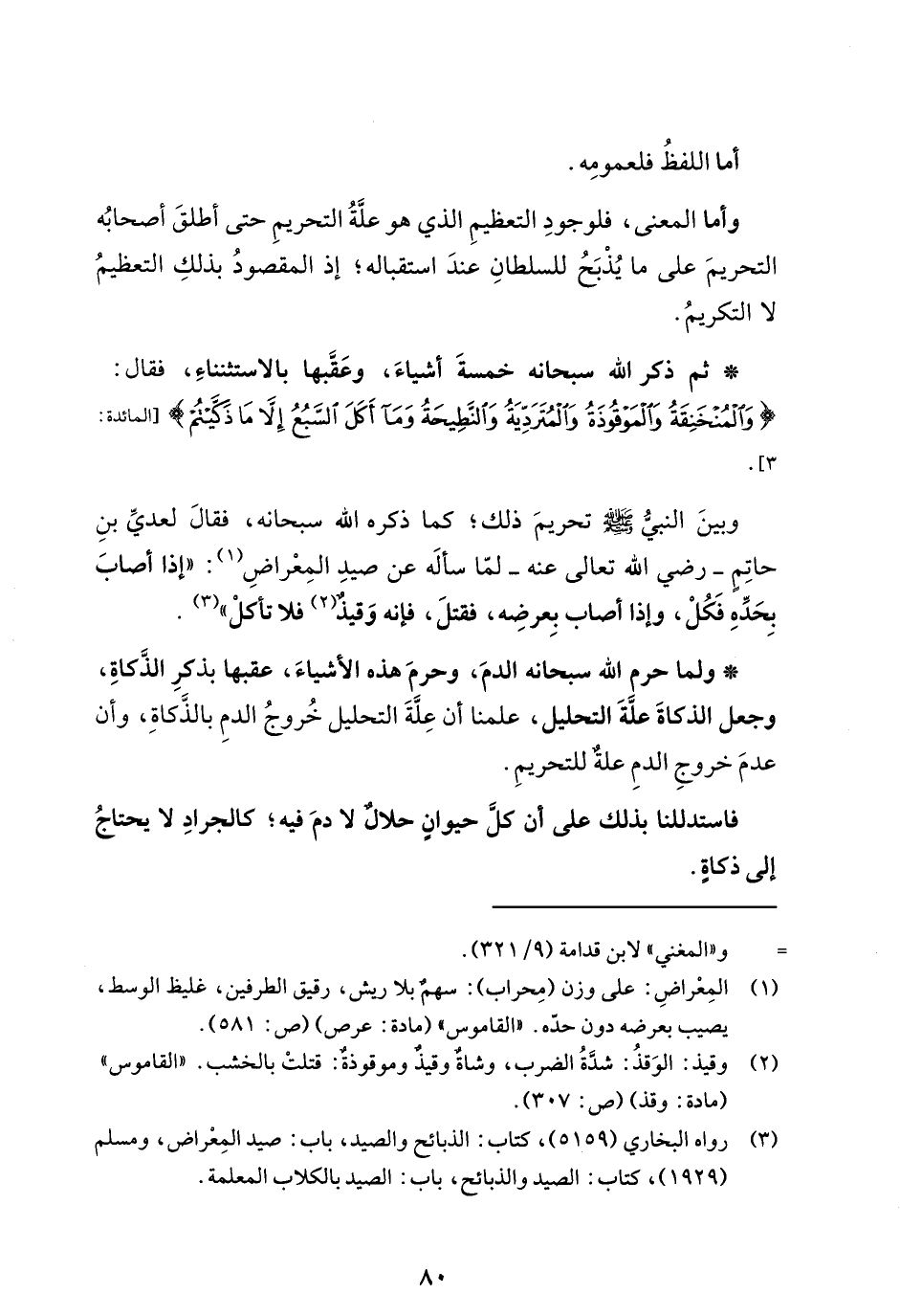 وبينَ النبيُّ - صلى الله عليه وسلم - تحريمَ ذلك؛ كما ذكره الله سبحانه، فقالَ لعديِّ بنِ حاتِمٍ -رضي الله تعالى عنه- لمّا سألَه عن صيدِ المِعْراضِ (¬1): "إذا أصابَ بِحَدِّهِ فَكُلْ، وإذا أصاب بِعرضِه، فقتلَ، فإنه وَقيذٌ (¬2) فلا تأكلْ" (¬3).