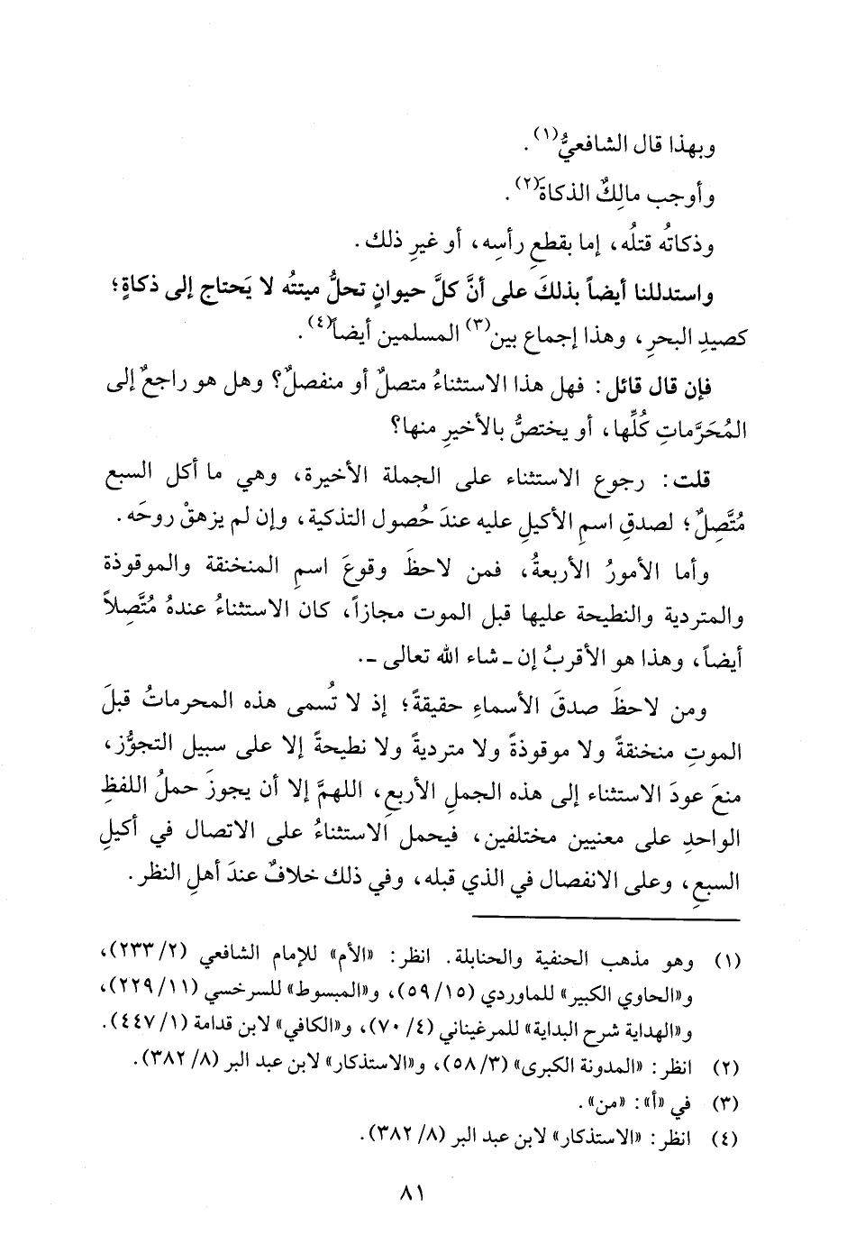 ومن لاحظَ صدقَ الأسماءِ حقيقةً؛ إذ لا تسُمى هذه المحرماتُ قبلَ الموتِ منخنقةً ولا موقوذة ولا مترديةً ولا نطيحةً إلا على سبيل التجوُّز، منعَ عودَ الاستثناء إلى هذه الجملِ الأربعِ، اللهمَّ إلا أن يجوزَ حملُ اللفظِ الواحدِ على معنيين مختلفين، فيحمل الاستثناءُ على الاتصال في أكيلِ السبعِ، وعلى الانفصال في الذي قبله، وفي ذلك خلاف عندَ أهلِ النظر.