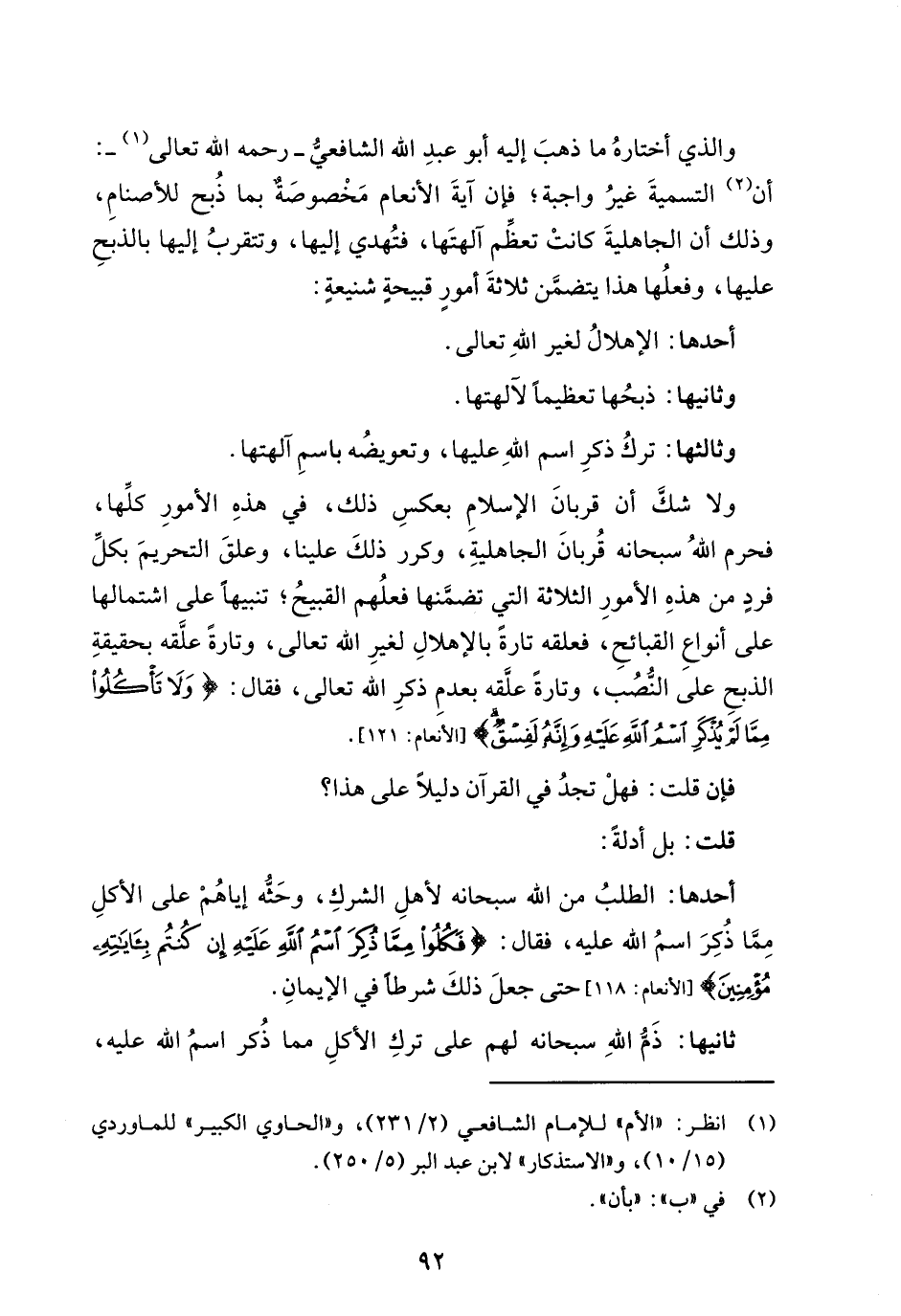 ولا شكَّ أن قربانَ الإسلامِ بعكسِ ذلك، في هذهِ الأمورِ كلِّها، فحرم الله سبحانه قُربانَ الجاهليةِ، وكرر ذلكَ علينا، وعلقَ التحريمَ بكلِّ فردٍ من هذهِ الأمورِ الثلاثة التي تضمَّنها فعلُهم القبيحُ؛ تنبيهًا على اشتمالها على أنواعِ القبائحِ، فعلقه تارةً بالإهلالِ لغيرِ الله تعالى، وتارةً علَّقه بحقيقةِ الذبحِ على النُّصُب، وتارةً علَّقه بعدمِ ذكرِ الله تعالى، فقال: {وَلَا تَأْكُلُوا مِمَّا لَمْ يُذْكَرِ اسْمُ اللَّهِ عَلَيْهِ وَإِنَّهُ لَفِسْقٌ} [الأنعام: 121].