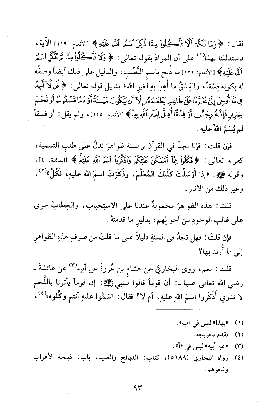 فإن قلت: فإنا نجدُ في القرآنِ والسنةِ ظواهرَ تدلُّ على طلبِ التسمية؛ كقوله تعالى: {فَكُلُوا مِمَّا أَمْسَكْنَ عَلَيْكُمْ وَاذْكُرُوا اسْمَ اللَّهِ عَلَيْهِ} [المائدة: 4]، وقوله - صلى الله عليه وسلم -: "إذا أَرْسَلْتَ كَلْبَكَ المُعَلَّمَ، وذَكَرْتَ اسمَ الله عليهِ، فَكُلْ" (¬2)، وغير ذلك من الآثار.