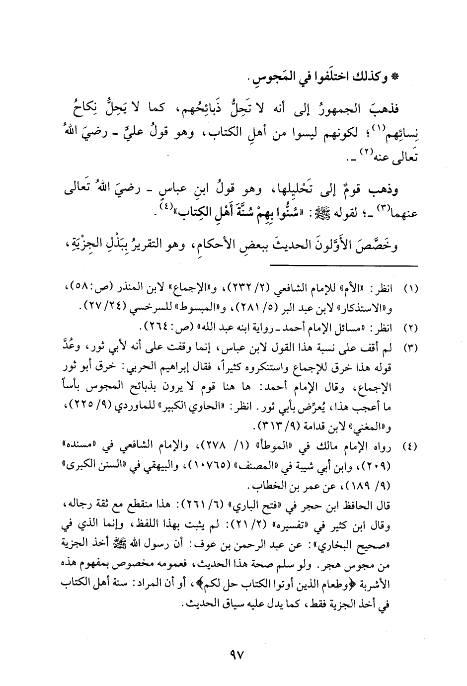 وخَصَّصَ الأَوَّلونَ الحديثَ ببعضِ الأحكامِ، وهو التقريرُ بِبَذْلِ الجِزْيَةِ،
