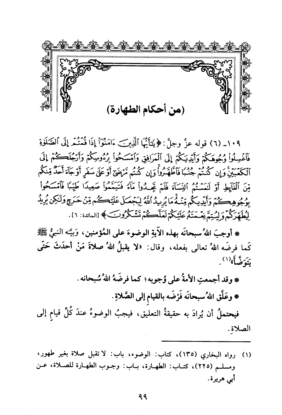 109 - (6) قوله عزَّ وجلَّ: {يَاأَيُّهَا الَّذِينَ آمَنُوا إِذَا قُمْتُمْ إِلَى الصَّلَاةِ فَاغْسِلُوا وُجُوهَكُمْ وَأَيْدِيَكُمْ إِلَى الْمَرَافِقِ وَامْسَحُوا بِرُءُوسِكُمْ وَأَرْجُلَكُمْ إِلَى الْكَعْبَيْنِ وَإِنْ كُنْتُمْ جُنُبًا فَاطَّهَّرُوا وَإِنْ كُنْتُمْ مَرْضَى أَوْ عَلَى سَفَرٍ أَوْ جَاءَ أَحَدٌ مِنْكُمْ مِنَ الْغَائِطِ أَوْ لَامَسْتُمُ النِّسَاءَ فَلَمْ تَجِدُوا مَاءً فَتَيَمَّمُوا صَعِيدًا طَيِّبًا فَامْسَحُوا بِوُجُوهِكُمْ وَأَيْدِيكُمْ مِنْهُ مَا يُرِيدُ اللَّهُ لِيَجْعَلَ عَلَيْكُمْ مِنْ حَرَجٍ وَلَكِنْ يُرِيدُ لِيُطَهِّرَكُمْ وَلِيُتِمَّ نِعْمَتَهُ عَلَيْكُمْ لَعَلَّكُمْ تَشْكُرُونَ} [المائدة: 6].