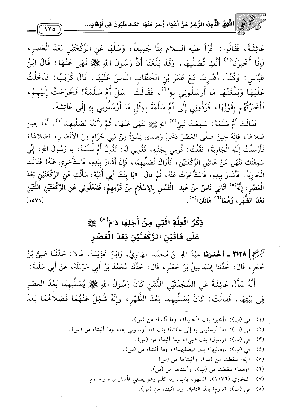 ذِكْرُ الْعِلَّةِ الَّتِي مِنْ أَجْلِهَا دَامَ صَلى الله عَلَيه وسَلم عَلَى هَاتَيْنِ الرَّكْعَتَيْنِ بَعْدَ الْعَصْرِ.