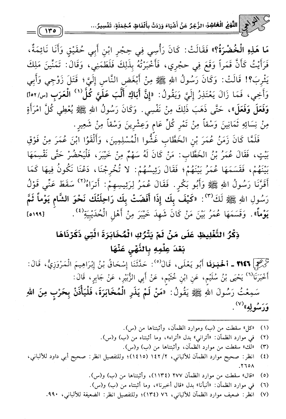 فَلَمَّا كَانَ زَمَنَ عُمَرَ بْنِ الْخَطَّابِ، غَشُّوا الْمُسْلِمِينَ، وَأَلْقَوُا ابْنَ عُمَرَ مِنْ فَوْقِ بَيْتٍ، فَقَالَ عُمَرُ بْنُ الْخَطَّابِ: مَنْ كَانَ لَهُ سَهْمٌ مِنْ خَيْبَرَ، فَلْيَحْضُرْ حَتَّى نَقْسِمَهَا بَيْنَهُمْ، فَقَسَمَهَا عُمَرُ بَيْنَهُمْ، فَقَالَ رَئِيسُهُمْ: لَا تُخْرِجْنَا، دَعْنَا نَكُونُ فِيهَا كَمَا أَقَرَّنَا رَسُولُ اللهِ صَلى الله عَلَيه وسَلم، وَأَبُو بَكْرٍ، فَقَالَ عُمَرُ لِرَئِيسِهِمْ: أَتَرَاهُ سَقَطَ عَنِّي قَوْلُ رَسُولِ اللهِ صَلى الله عَلَيه وسَلم لَكَ: "كَيْفَ بِكَ إِذَا أَفَضَتْ بِكَ رَاحِلَتُكَ نَحْوَ الشَّامِ يَوْمًا ثُمَّ يَوْمًا"، وَقَسَمَهَا عُمَرُ بَيْنَ مَنْ كَانَ شَهِدَ خَيْبَرَ مِنْ أَهْلِ الْحُدَيْبِيَةِ. [٥١٩٩]