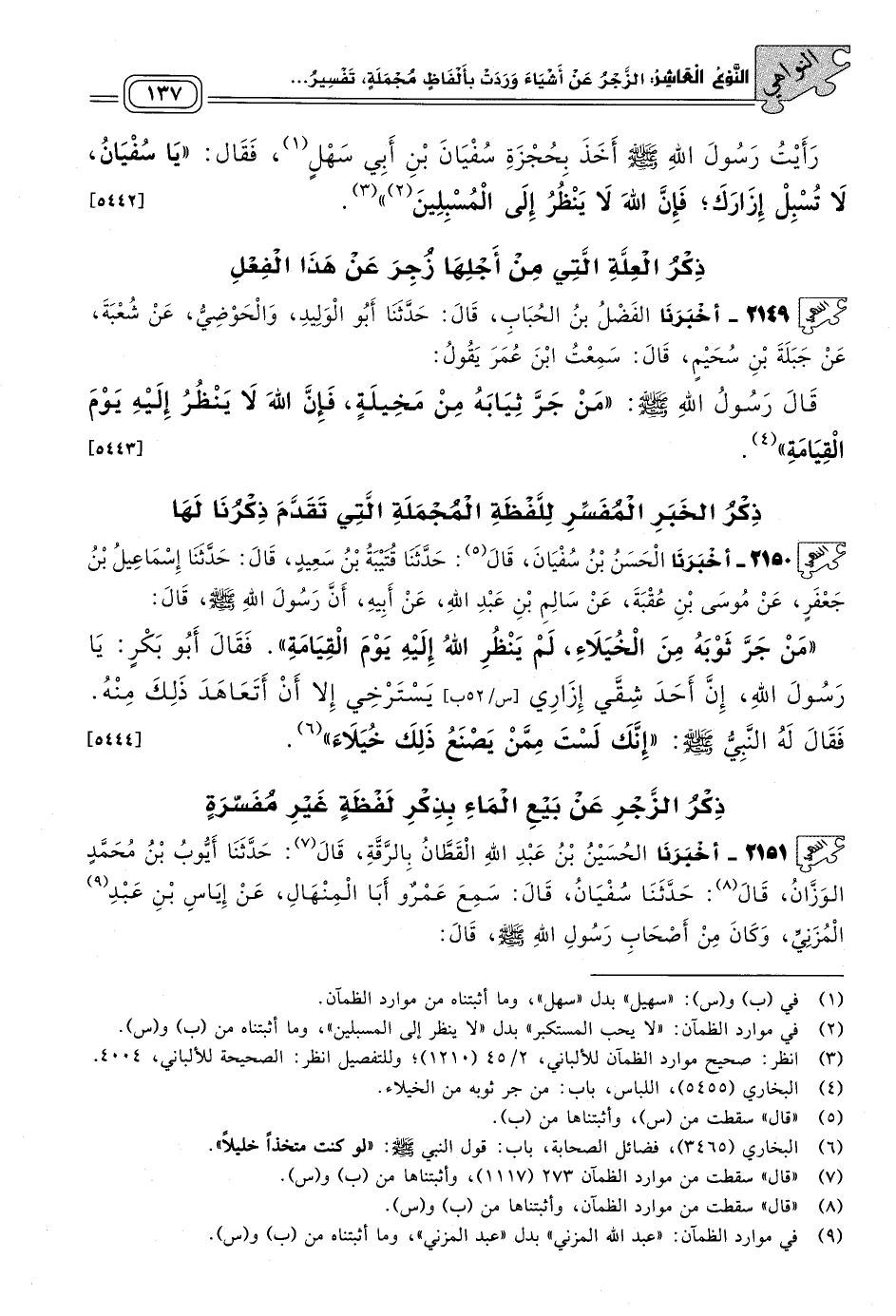 ٢١٤٩ - أَخبَرنا الْفَضْلُ بْنُ الْحُبَابِ، قَالَ: حَدثنا أَبُو الْوَلِيدِ، وَالْحَوْضِيُّ، عَنْ شُعْبَةَ، عَنْ جَبَلَةَ بْنِ سُحَيْمٍ، قَالَ: سَمِعْتُ ابْنَ عُمَرَ، يَقُولُ: قَالَ رَسُولُ اللهِ صَلى الله عَلَيه وسَلم: "مَنْ جَرَّ ثِيَابَهُ مِنْ مَخِيلَةٍ فَإِنَّ اللهَ لَا يَنْظُرُ إِلَيْهِ يَوْمَ الْقِيَامَةِ". [٥٤٤٣]