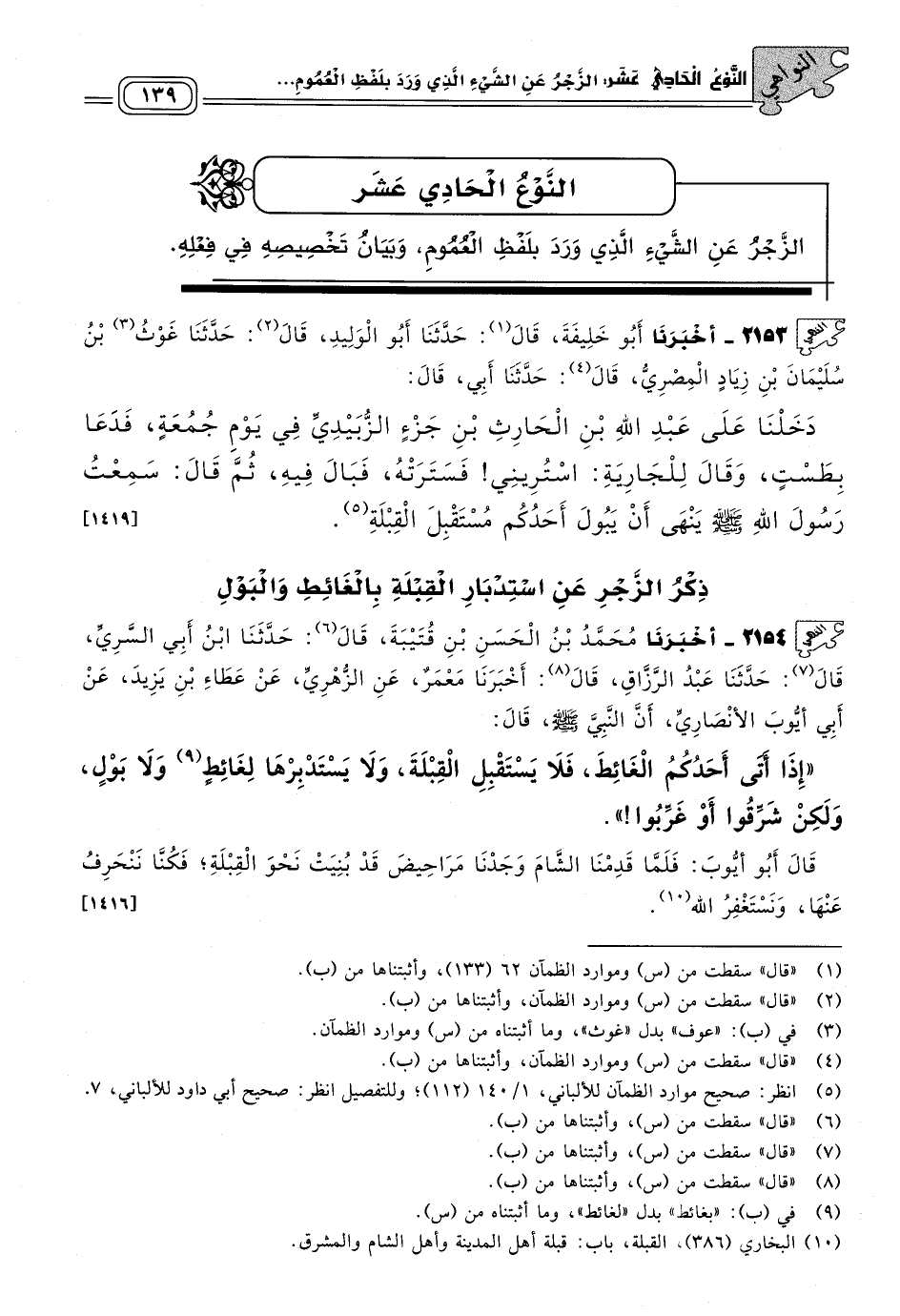 قَالَ أَبُو أَيُّوبَ: فَلَمَّا قَدِمْنَا الشَّامَ وَجَدْنَا مَرَاحِيضَ قَدْ بُنِيَتْ نَحْوَ الْقِبْلَةِ، فَكُنَّا نَنْحَرِفُ عَنْهَا وَنَسْتَغْفِرُ اللهَ. [١٤١٦]