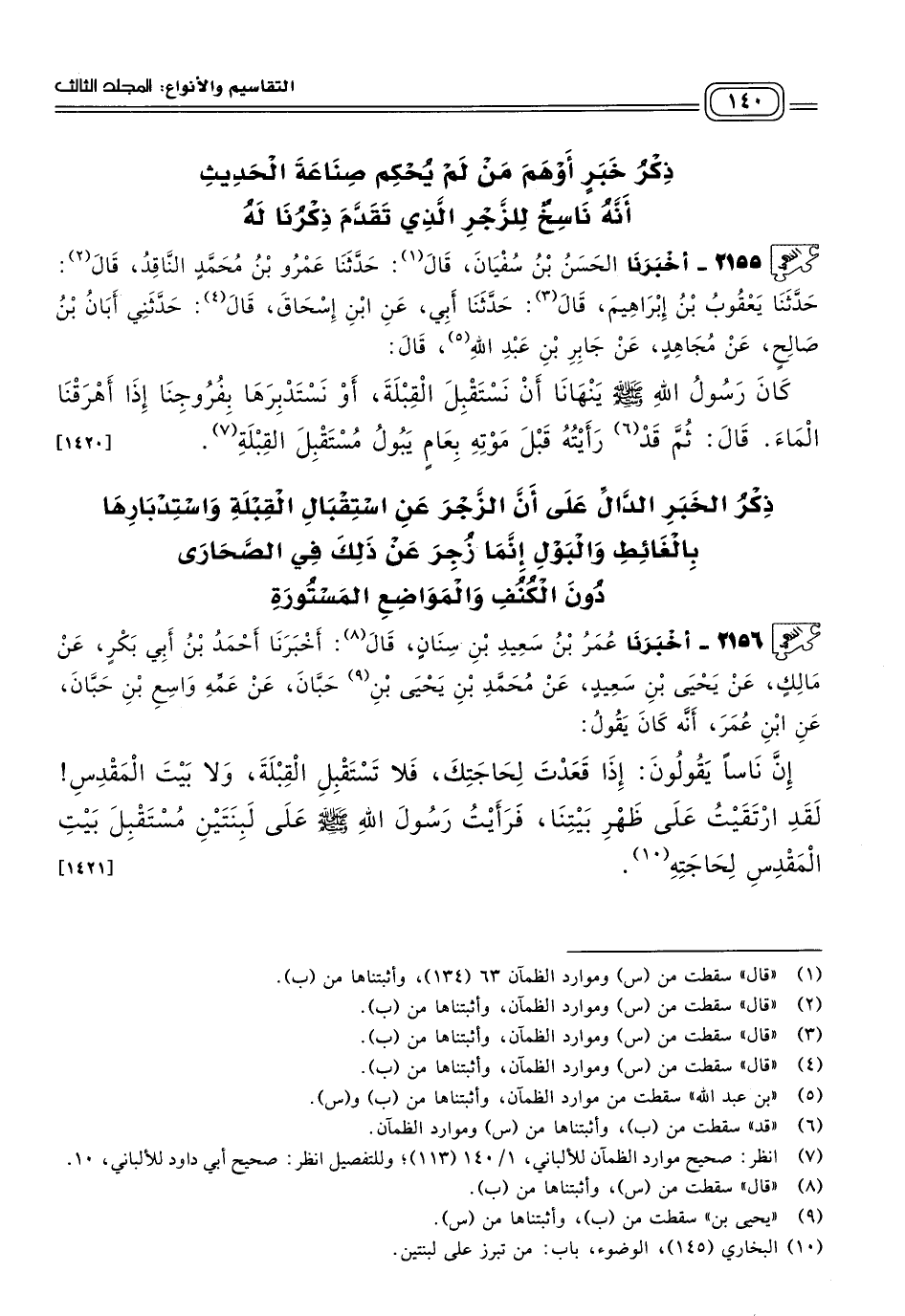 ٢١٥٦ - أَخبَرنا عُمَرُ بْنُ سَعِيدِ بْنِ سِنَانٍ، قَالَ: أَخبَرنا أَحْمَدُ بْنُ أَبِي بَكْرٍ، عَنْ مَالِكٍ، عَنْ يَحْيَى بْنِ سَعِيدٍ، عَنْ مُحَمَّدِ بْنِ يحيى بن حَبَّانَ، عَنْ عَمِّهِ وَاسِعِ بْنِ حَبَّانَ، عَنِ ابْنِ عُمَرَ، أَنَّهُ كَانَ يَقُولُ: إِنَّ نَاسًا يَقُولُونَ: إِذَا قَعَدْتَ لِحَاجَتِكَ فَلَا تَسْتَقْبِلِ الْقِبْلَةَ، وَلَا بَيْتَ الْمَقْدِسِ، لَقَدِ ارْتَقَيْتُ عَلَى ظَهْرِ بَيْتِنَا فَرَأَيْتُ رَسُولَ اللهِ صَلى الله عَلَيه وسَلم عَلَى لَبِنَتَيْنِ مُسْتَقْبِلَ بَيْتِ الْمَقْدِسِ لِحَاجَتِهِ. [١٤٢١]