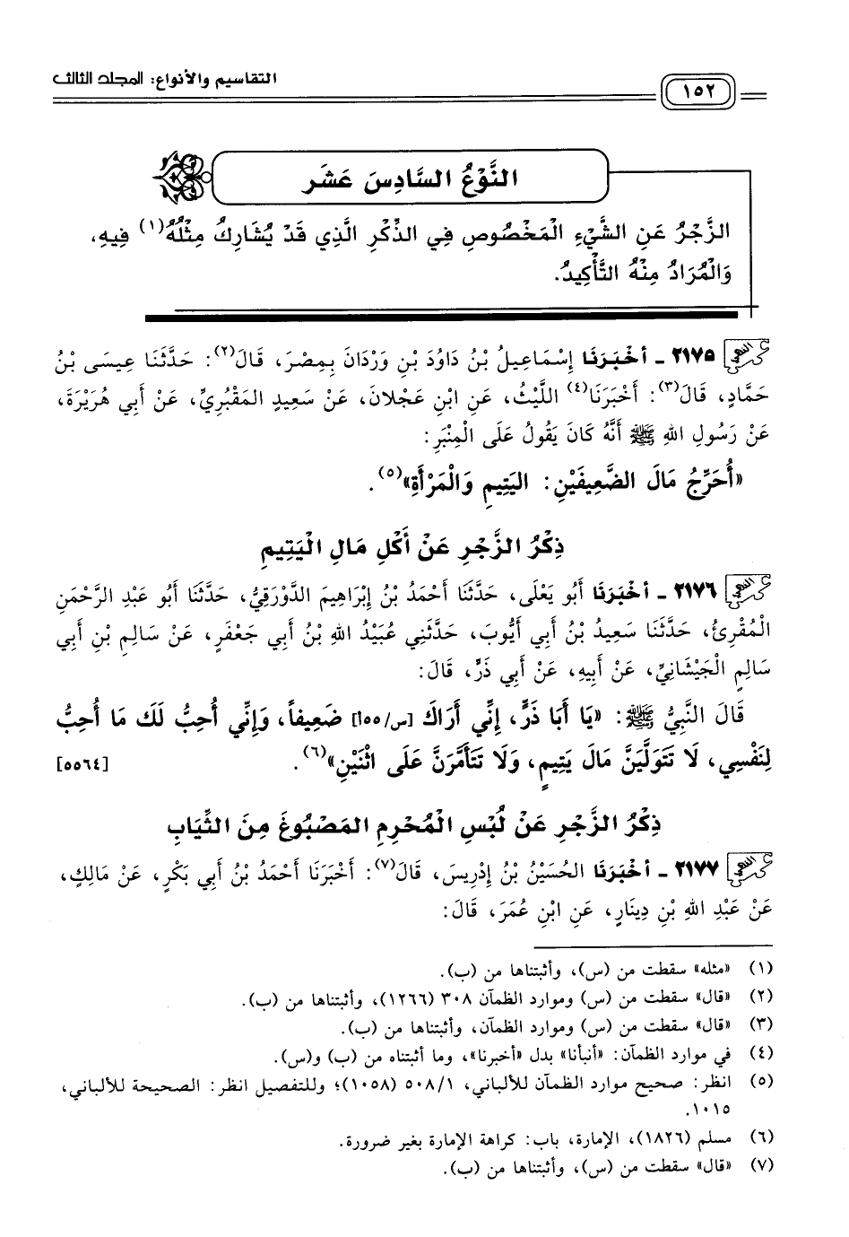 ٢١٧٥ - أَخبَرنا إِسْمَاعِيلُ بْنُ دَاوُدَ بْنِ وَرْدَانَ، بِمِصْرَ، قَالَ: حَدثنا عِيسَى بْنُ حَمَّادٍ، قَالَ: أَخبَرنا اللَّيْثُ، عَنِ ابْنِ عَجْلَانَ، عَنْ سَعِيدٍ الْمَقْبُرِيِّ، عَنْ أَبِي هُرَيْرَةَ، عَنْ رَسُولِ اللهِ صَلى الله عَلَيه وسَلم أَنَّهُ كَانَ يَقُولُ عَلَى الْمِنْبَرِ: "أُحَرِّجُ مَالَ الضَّعِيفَيْنِ: الْيَتِيمِ وَالْمَرْأَةِ". [٥٥٦٥]