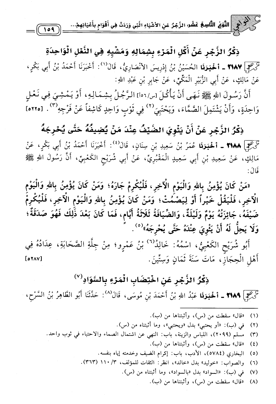 ٢١٨٨ - أَخبَرنا عُمَرُ بْنُ سَعِيدِ بْنِ سِنَانٍ، قَالَ: أَخبَرنا أَحْمَدُ بْنُ أَبِي بَكْرٍ، عَنْ مَالِكٍ، عَنْ سَعِيدِ بْنِ أَبِي سَعِيدٍ الْمَقْبُرِيِّ، عَنْ أَبِي شُرَيْحٍ الْكَعْبِيِّ، أَنَّ رَسُولَ اللهِ صَلى الله عَلَيه وسَلم قَالَ: "مَنْ كَانَ يُؤْمِنُ بِاللهِ وَالْيَوْمِ الآخِرِ فَلْيُكْرِمْ جَارَهُ، وَمَنْ كَانَ يُؤْمِنُ بِاللهِ وَالْيَوْمِ الآخِرِ، فَلْيَقُلْ خَيْرًا، أَوْ لِيَصْمُتَ، وَمَنْ كَانَ يُؤْمِنُ بِاللهِ وَالْيَوْمِ الآخِرِ فَلْيُكْرِمْ ضَيْفَهُ، جَائِزَتُهُ يَوْمٌ وَلَيْلَةٌ، وَالضِّيَافَةُ ثَلَاثَةُ أَيَّامٍ، فَمَا كَانَ بَعْدَ ذَلِكَ فَهُوَ صَدَقَةٌ، وَلَا يَحِلُّ لَهُ أَنْ يَثْوِيَ عِنْدَهُ حَتَّى يُحْرِجَهُ".