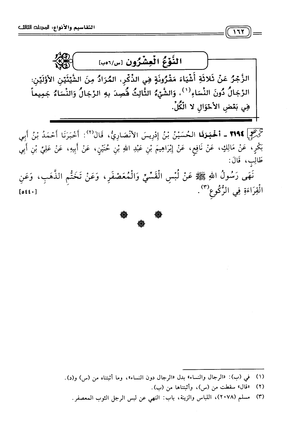 ٢١٩٤ - أَخبَرنا الْحُسَيْنُ بْنُ إِدْرِيسَ الأَنْصَارِيُّ، قَالَ: أَخبَرنا أَحْمَدُ بْنُ أَبِي بَكْرٍ، عَنْ مَالِكٍ، عَنْ نَافِعٍ، عَنْ إِبْرَاهِيمَ بْنِ عَبْدِ اللهِ بْنِ حُنَيْنٍ، عَنْ أَبِيهِ، عَنْ عَلِيِّ بْنِ أَبِي طَالِبٍ، قَالَ: نَهَى رَسُولُ اللهِ صَلى الله عَلَيه وسَلم عَنْ لُبْسِ الْقَسِّيِّ وَالْمُعَصْفَرِ، وَعَنْ تَخَتُّمِ الذَّهَبِ، وَعَنِ الْقِرَاءَةِ فِي الرُّكُوعِ. [٥٤٤٠]