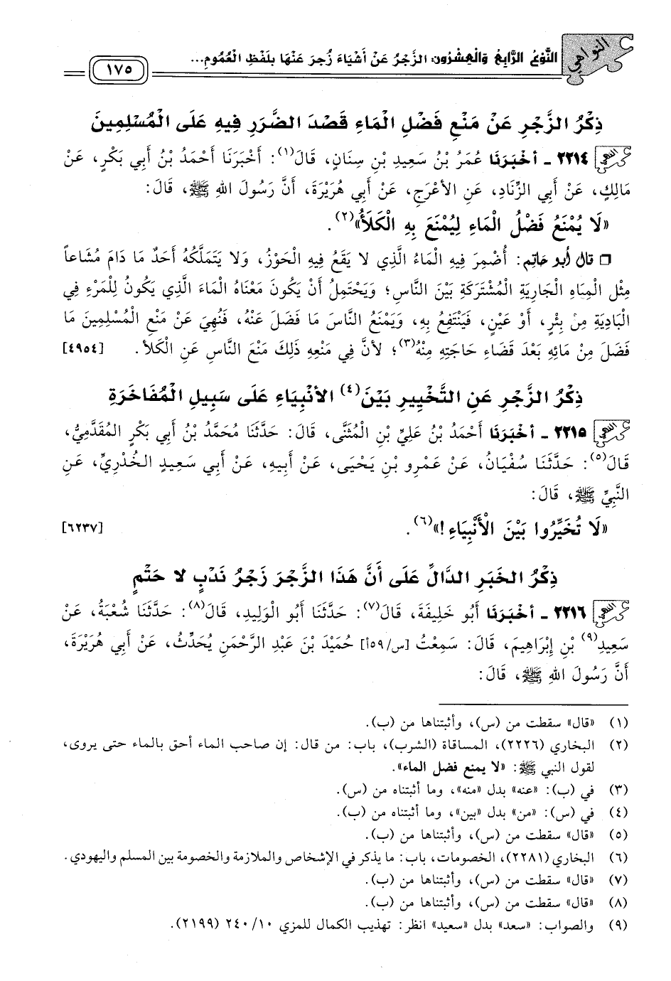 قَالَ أَبُو حَاتِمٍ: أَضْمَرَ فِيهِ الْمَاءَ، الَّذِي لَا يَقَعُ فِيهِ الْحَوْزُ وَلَا يَتَمَلَّكُهُ أَحَدٌ مَا دَامَ مَشَاعًا مِثْلَ الْمِيَاهِ الْجَارِيَةِ الْمُشْتَرِكَةِ بَيْنَ النَّاسِ، وَيَحْتَمِلُ أَنْ يَكُونَ مَعْنَاهُ الْمَاءُ الَّذِي يَكُونُ لِلْمَرْءِ فِي الْبَادِيَةِ، مِنْ بِئْرٍ، أَوْ عَيْنٍ، فَيَنْتَفِعُ بِهِ، وَيَمْنَعُ النَّاسَ مَا فَضَلَ عَنْهُ، فَنُهِيَ عَنْ مَنْعِ الْمُسْلِمِينَ مَا فَضَلَ مِنْ مَائِهِ، بَعْدَ قَضَاءِ حَاجَتِهِ منْهُ، لأَنَّ فِي مَنْعِهِ ذَلِكَ مَنْعَ النَّاسِ عَنِ الْكَلأ. [٤٩٥٤]