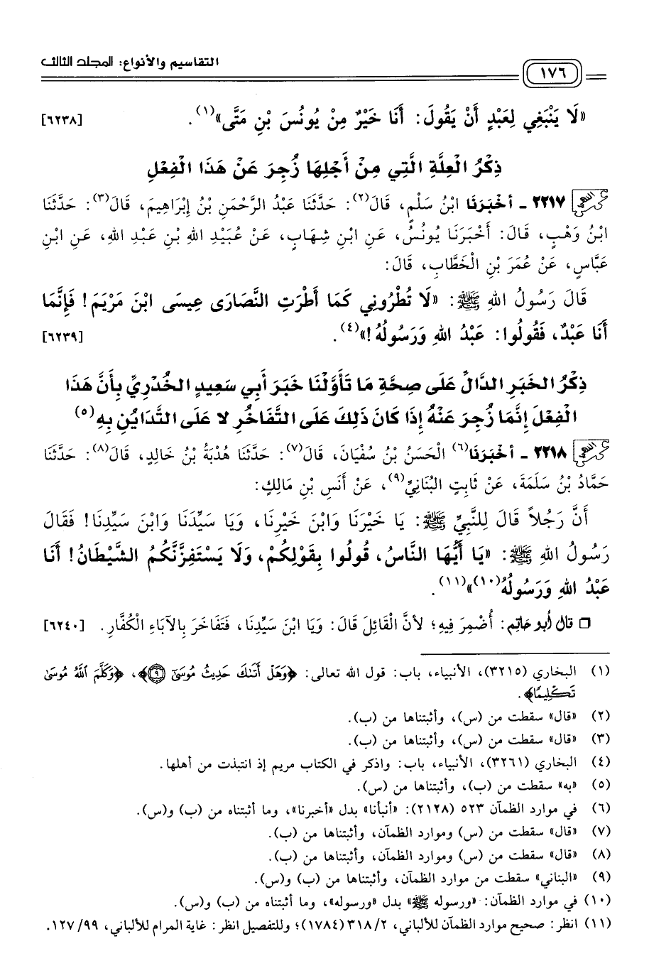 ٢٢١٨ - أَخبَرنا الْحَسَنُ بْنُ سُفْيَانَ، قَالَ: حَدثنا هُدْبَةُ بْنُ خَالِدٍ، قَالَ: حَدثنا حَمَّادُ بْنُ سَلَمَةَ، عَنْ ثَابِتٍ الْبُنَانِيِّ، عَنْ أَنَسِ بْنِ مَالِكٍ، أَنَّ رَجُلاً قَالَ لِلنَّبِيِّ صَلى الله عَلَيه وسَلم: يَا خَيْرَنَا وَابْنَ خَيْرِنَا، وَيَا سَيِّدَنَا وَابْنَ سَيِّدِنَا، فَقَالَ رَسُولُ اللهِ صَلى الله عَلَيه وسَلم: "يَا أَيُّهَا النَّاسُ قُولُوا بِقَوْلِكُمْ وَلَا يَسْتَفِزَّنَّكُمُ الشَّيْطَانُ، أَنَا عَبْدُ اللهِ وَرَسُولُهُ".