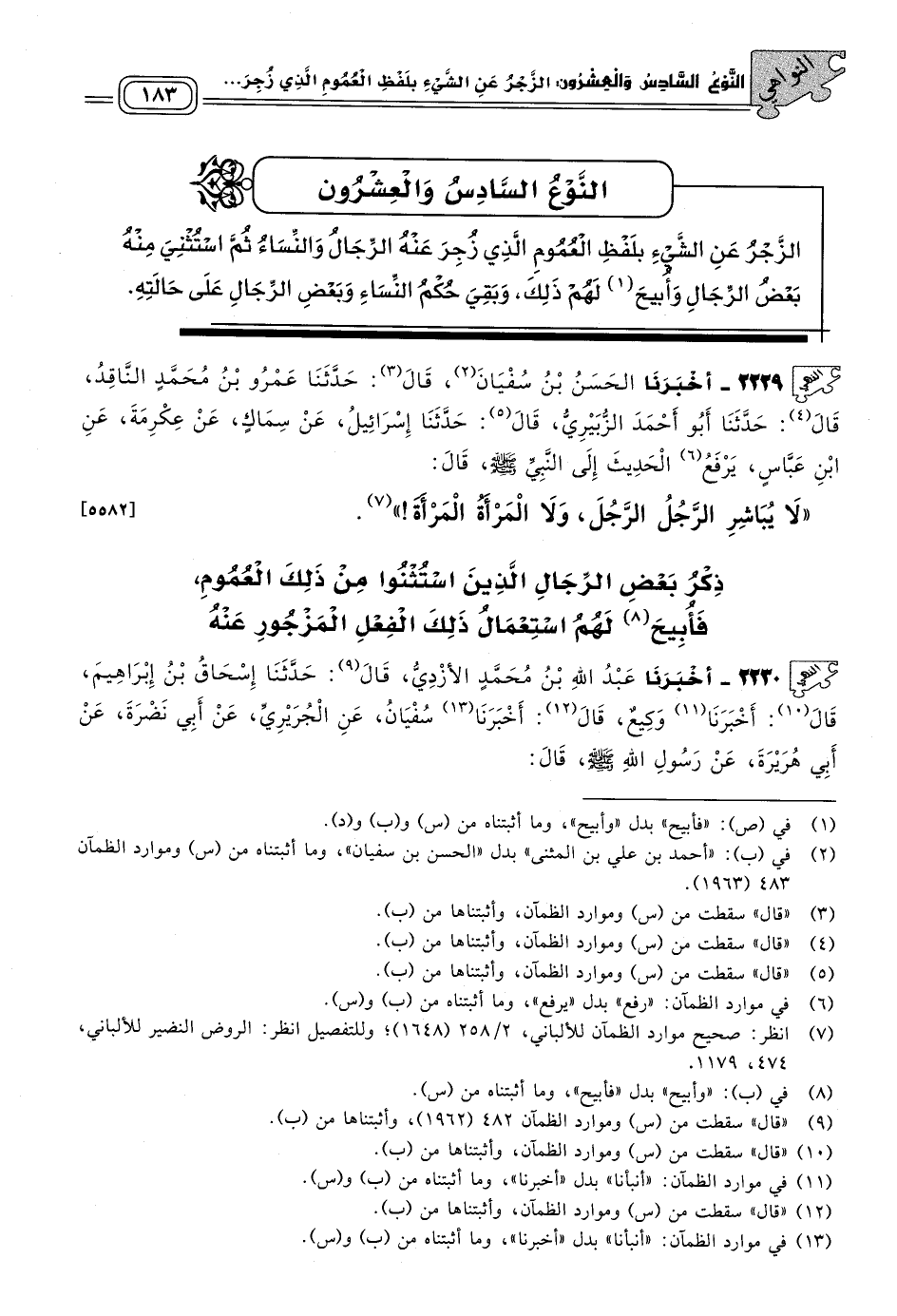 ٢٢٢٩ - أخبرنا الحسن بن سفيان، قال: حدثنا عمرو بن محمد الناقد، قال: حدثنا أبو أحمد الزبيري، قال: حدثنا إسرائيل، عن سماك، عن عكرمة، عن ابن عباس، يرفع الحديث إلى النبي صلى الله عليه وسلم، قال: "لا يباشر الرجل الرجل، ولا المرأة المرأة". [٥٥٨٢]