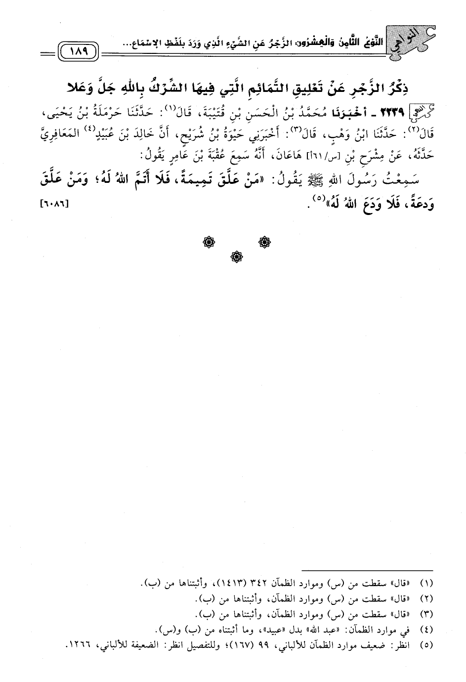 ٢٢٣٩ - أَخبَرنا مُحَمَّدُ بْنُ الْحَسَنِ بْنِ قُتَيْبَةَ، قَالَ: حَدثنا حَرْمَلَةُ بْنُ يَحْيَى، قَالَ: حَدثنا ابْنُ وَهْبٍ، قَالَ: أَخْبَرَنِي حَيْوَةُ بْنُ شُرَيْحٍ، أَنَّ خَالِدَ بْنَ عُبَيْدٍ الْمَعَافِرِيَّ حَدَّثَهُ، عَنْ مِشْرَحِ بْنِ هَاعَانَ، أَنَّهُ سَمِعَ عُقْبَةَ بْنَ عَامِرٍ، يَقُولُ: سَمِعْتُ رَسُولَ اللهِ صَلى الله عَلَيه وسَلم يَقُولُ: "مَنْ عَلَّقَ تَمِيمَةً فَلَا أَتَمَّ اللهُ لَهُ، وَمَنْ عَلَّقَ وَدَعَةً فَلَا وَدَعَ اللهُ لَهُ". [٦٠٨٦]