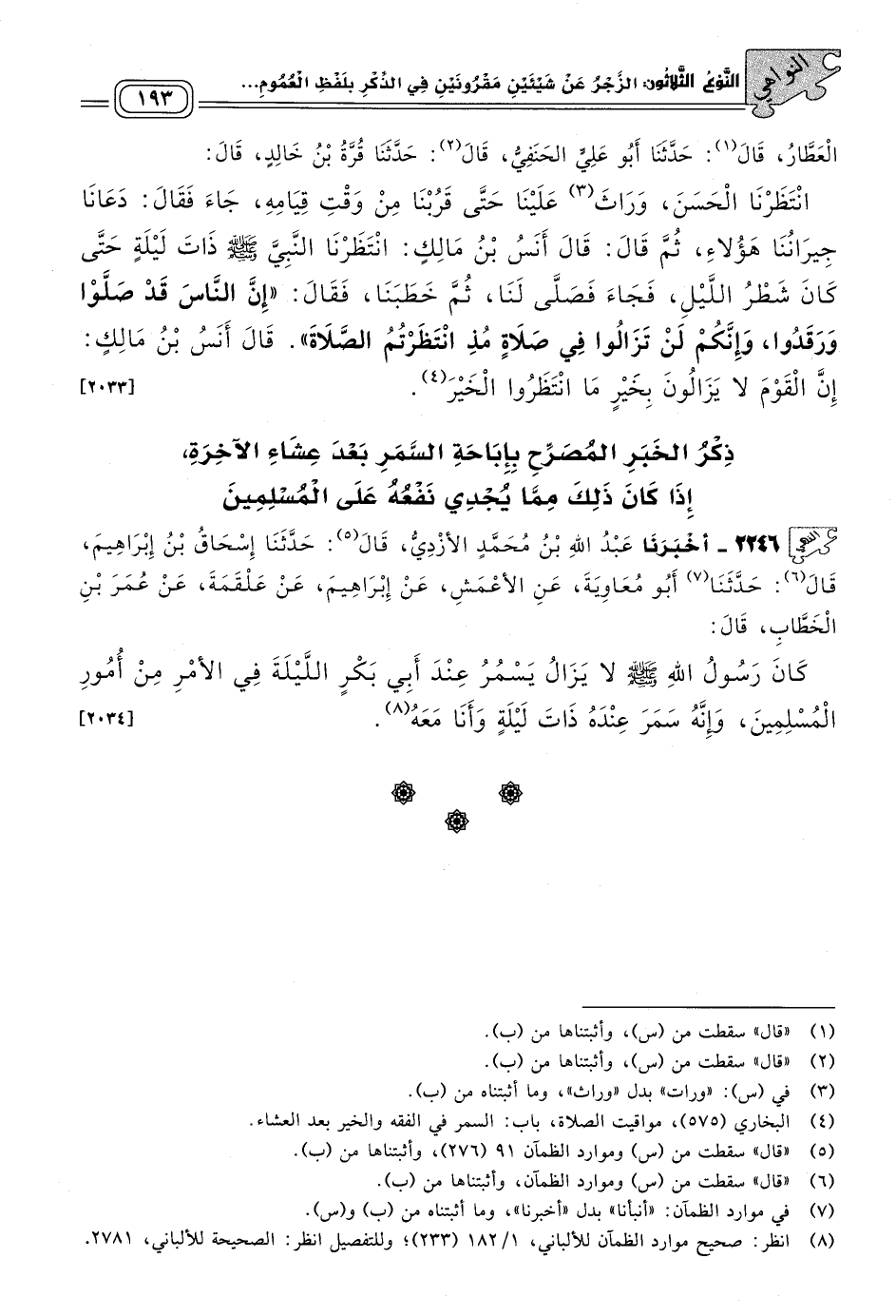 ذِكْرُ الْخَبَرِ الْمُصَرِّحِ بِإِبَاحَةِ السَّمَرِ بَعْدَ عِشَاءِ الآخِرَةِ إِذَا كَانَ ذَلِكَ مِمَّا يُجْدِي نَفْعُهُ عَلَى الْمُسْلِمِينَ.