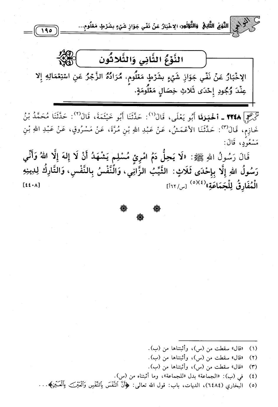 ٢٢٤٨ - أَخبَرنا أَبُو يَعْلَى، قَالَ: حَدثنا أَبُو خَيْثَمَةَ، قَالَ: حَدثنا مُحَمَّدُ بْنُ خَازِمٍ، قَالَ: حَدثنا الأَعْمَشُ، عَنْ عَبْدِ اللهِ بْنِ مُرَّةَ، عَنْ مَسْرُوقٍ، عَنْ عَبْدِ اللهِ بْنِ مَسْعُودٍ قَالَ: قَالَ رَسُولُ اللهِ صَلى الله عَلَيه وسَلم: "لَا يَحِلُّ دَمُ امْرِئٍ مُسْلِمٍ يَشْهَدُ أَنْ لَا إِلَهَ إِلَاّ اللهُ وَأَنِّي رَسُولُ اللهِ إِلَاّ بِإِحْدَى ثَلَاثٍ: الثَّيِّبُ الزَّانِي، وَالنَّفْسُ بِالنَّفْسِ، وَالتَّارِكُ لِدِينِهِ الْمُفَارِقُ لِلْجَمَاعَةِ". [٤٤٠٨]