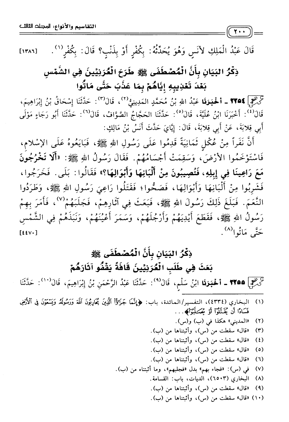 ٢٢٥٤ - أَخبَرنا عَبْدُ اللهِ بْنُ مُحَمَّدٍ الْمَدِينِيُّ، قَالَ: حَدثنا إِسْحَاقُ بْنُ إِبْرَاهِيمَ، قَالَ: أَخبَرنا ابْنُ عُلَيَّةَ، قَالَ: حَدثنا الْحَجَّاجُ الصَّوَّافُ، قَالَ: حَدثنا أَبُو رَجَاءٍ مَوْلَى أَبِي قِلَابَةَ، عَنْ أَبِي قِلَابَةَ، قَالَ: إِيَّايَ حَدَّثَ أَنَسُ بْنُ مَالِكٍ، أَنَّ نَفَرًا مِنْ عُكْلٍ ثَمَانِيَةً قَدِمُوا عَلَى رَسُولِ اللهِ صَلى الله عَلَيه وسَلم فَبَايَعُوهُ عَلَى الإِسْلَامِ، فَاسْتَوْخَمُوا الأَرْضَ، وَسَقِمَتْ أَجْسَامُهُمْ، فَقَالَ رَسُولُ اللهِ صَلى الله عَلَيه وسَلم: "أَلَا تَخْرُجُونَ مَعَ رَاعِينَا فِي إِبِلِهِ فَتُصِيبُونَ مِنْ أَلْبَانِهَا وَأَبْوَالِهَا؟ " فَقَالُوا: بَلَى، فَخَرَجُوا فَشَرِبُوا مِنْ أَلْبَانِهَا وَأَبْوَالِهَا، فَصَحُّوا، فَقَتَلُوا رَاعِيَ رَسُولِ اللهِ صَلى الله عَلَيه وسَلم، وَطَرَدُوا النَّعَمَ، فَبَلَغَ ذَلِكَ رَسُولَ اللهِ صَلى الله عَلَيه وسَلم، فَبَعَثَ فِي آثَارِهِمْ فَجَلَبَهُمْ، فَأَمَرَ بِهِمْ رَسُولُ اللهِ صَلى الله عَلَيه وسَلم فَقَطَعَ أَيْدِيَهُمْ، وَأَرْجُلَهُمْ، وَسَمَرَ أَعْيُنَهُمْ، وَنَبَذَهُمْ فِي الشَّمْسِ حَتَّى مَاتُوا. [٤٤٧٠]