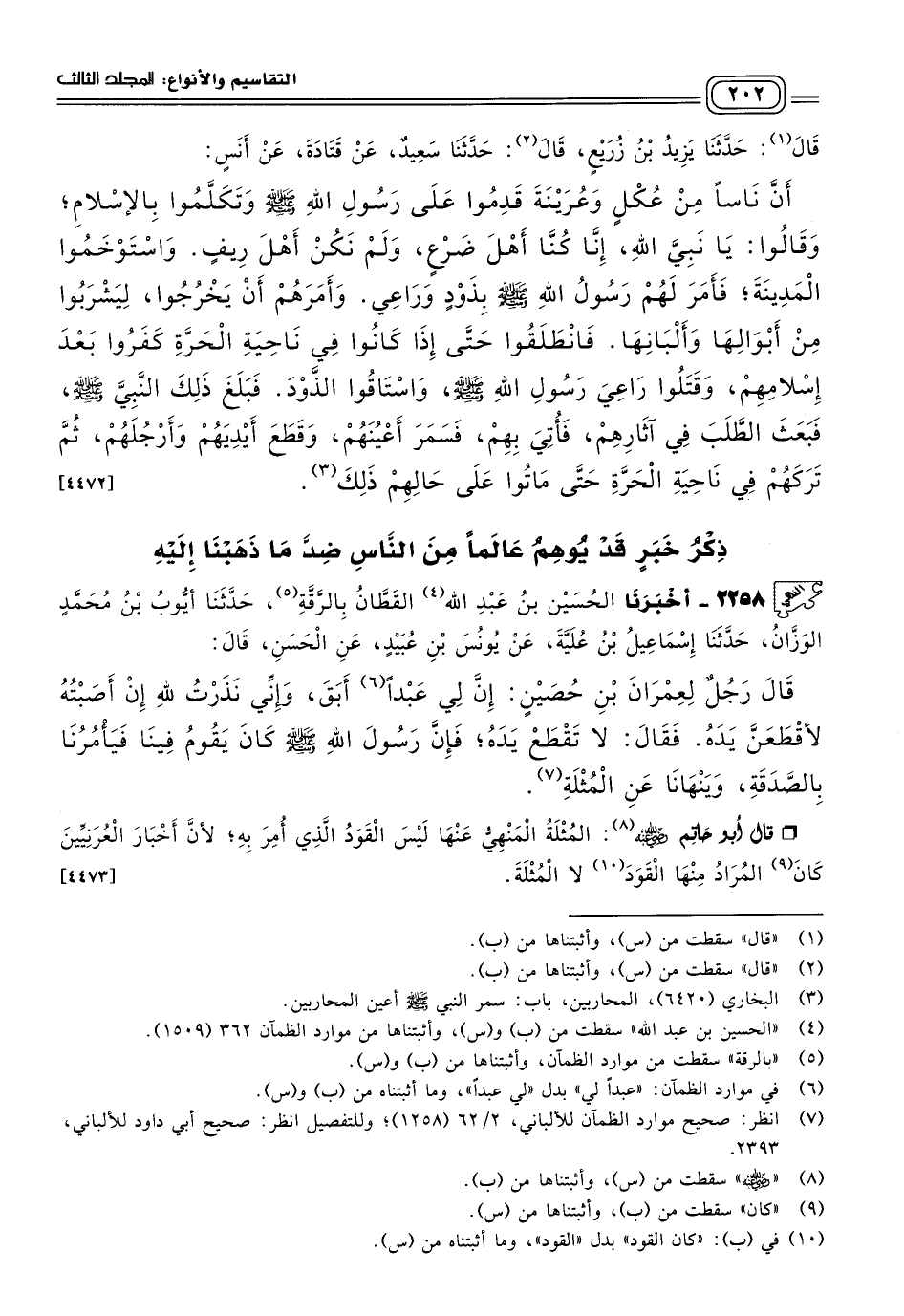 قَالَ أَبُو حَاتِمٍ رَضِيَ اللهُ عَنْهُ: الْمُثْلَةُ الْمَنْهِيُّ عَنْهَا لَيْسَ الْقَوَدُ الَّذِي أَمَرَ بِهِ، لأَنَّ أَخْبَارَ الْعُرَنِيِّينَ كان الْمُرَادُ مِنْهَا الْقَوَدَ لَا الْمُثْلَةَ. [٤٤٧٣]