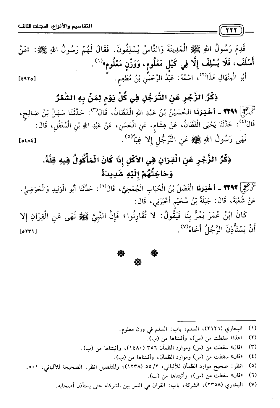 ٢٢٩٢ - أَخبَرنا الْفَضْلُ بْنُ الْحُبَابِ الْجُمَحِيُّ، قَالَ: حَدثنا أَبُو الْوَلِيدِ، وَالْحَوْضِيُّ، عَنْ شُعْبَةَ، قَالَ جَبَلَةُ بْنُ سُحَيْمٍ أَخْبَرَنِي، قَالَ: كَانَ ابْنُ عُمَرَ يَمُرُّ بِنَا فَيَقُولُ: لَا تُقَارِنُوا، فَإِنَّ النَّبِيَّ صَلى الله عَلَيه وسَلم نَهَى عَنِ الْقِرَانِ إِلَاّ أَنْ يَسْتَأْذِنَ الرَّجُلُ أَخَاهُ. [٥٢٣١]