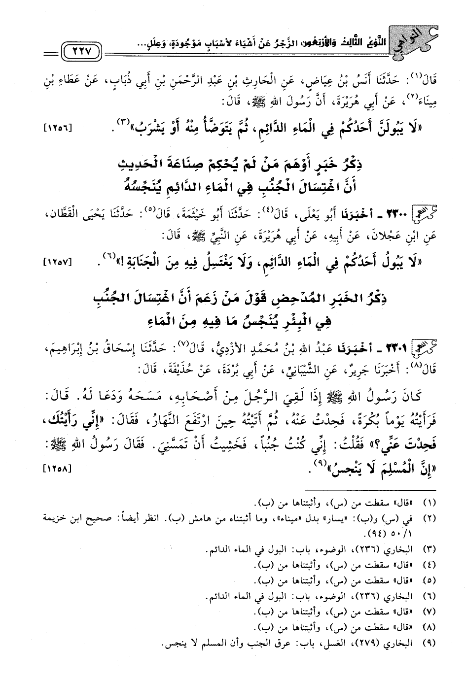 ٢٣٠١ - أَخبَرنا عَبْدُ اللهِ بْنُ مُحَمَّدٍ الأَزْدِيُّ، قَالَ: حَدثنا إِسْحَاقُ بْنُ إِبْرَاهِيمَ، قَالَ: أَخبَرنا جَرِيرٌ، عَنِ الشَّيْبَانِيِّ، عَنْ أَبِي بُرْدَةَ، عَنْ حُذَيْفَةَ، قَالَ: كَانَ رَسُولُ اللهِ صَلى الله عَلَيه وسَلم إِذَا لَقِيَ الرَّجُلَ مِنْ أَصْحَابِهِ مَسَحَهُ وَدَعَا لَهُ، قَالَ: فَرَأَيْتُهُ يَوْمًا بُكْرَةً، فَحِدْتُ عَنْهُ، ثُمَّ أَتَيْتُهُ حِينَ ارْتَفَعَ النَّهَارُ، فَقَالَ: "إِنِّي رَأَيْتُكَ، فَحِدْتَ عَنِّي"، فَقُلْتُ: إِنِّي كُنْتُ جُنُبًا، فَخَشِيتُ أَنْ تَمَسَّنِي، فَقَالَ رَسُولُ اللهِ صَلى الله عَلَيه وسَلم: "إِنَّ الْمُسْلِمَ لَا يَنْجُسُ". [١٢٥٨]