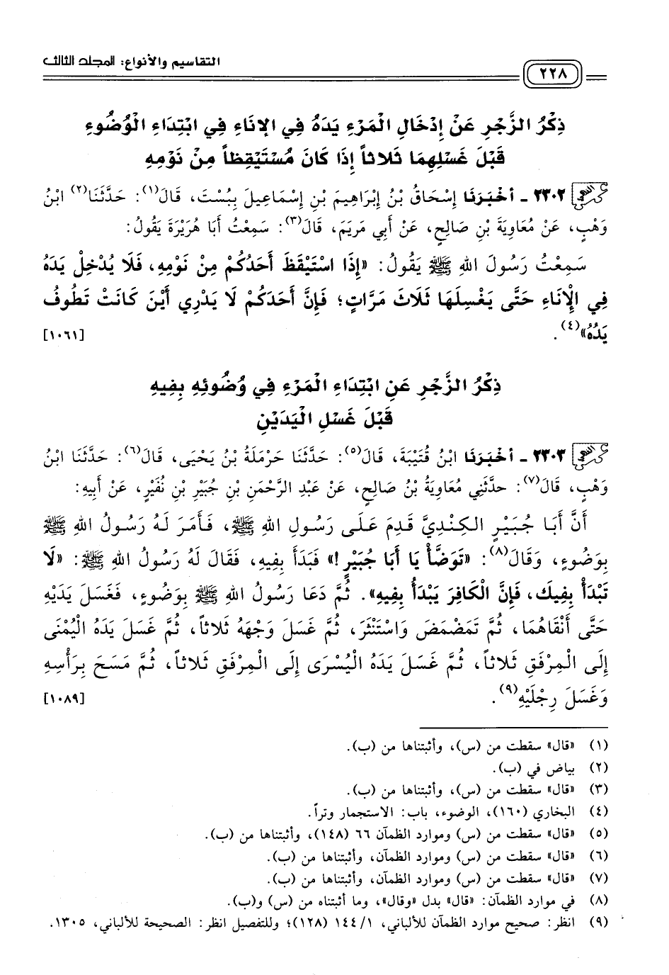 ٢٣٠٣ - أَخبَرنا ابْنُ قُتَيْبَةَ، قَالَ: حَدثنا حَرْمَلَةُ بْنُ يَحْيَى، قَالَ: حَدثنا ابْنُ وَهْبٍ، قَالَ: حَدَّثَنِي مُعَاوِيَةُ بْنُ صَالِحٍ، عَنْ عَبْدِ الرَّحْمَنِ بْنِ جُبَيْرِ بْنِ نُفَيْرٍ، عَنْ أَبِيهِ، أَنَّ أَبَا جُبَيْرٍ الْكِنْدِيَّ قَدِمَ عَلَى رَسُولِ اللهِ صَلى الله عَلَيه وسَلم، فَأَمَرَ لَهُ رَسُولُ اللهِ صَلى الله عَلَيه وسَلم بِوَضُوءٍ، وَقَالَ: "تَوَضَّأْ يَا أَبَا جُبَيْرٍ"، فَبَدَأَ بِفِيهِ، فَقَالَ لَهُ رَسُولُ اللهِ صَلى الله عَلَيه وسَلم: "لَا تَبْدَأْ بِفِيكَ، فَإِنَّ الْكَافِرَ يَبْدَأُ بِفِيهِ"، ثُمَّ دَعَا رَسُولُ اللهِ صَلى الله عَلَيه وسَلم بِوَضُوءٍ، فَغَسَلَ يَدَيْهِ حَتَّى أَنْقَاهُمَا، ثُمَّ تَمَضْمَضَ وَاسْتَنْثَرَ، ثُمَّ غَسَلَ وَجْهَهُ ثَلَاثًا، ثُمَّ غَسَلَ يَدَهُ الْيُمْنَى إِلَى الْمِرْفَقِ ثَلَاثًا، ثُمَّ غَسَلَ يَدَهُ الْيُسْرَى إِلَى الْمِرْفَقِ ثَلَاثًا، ثُمَّ مَسَحَ بِرَأْسِهِ وَغَسَلَ رِجْلَيْهِ. [١٠٨٩]