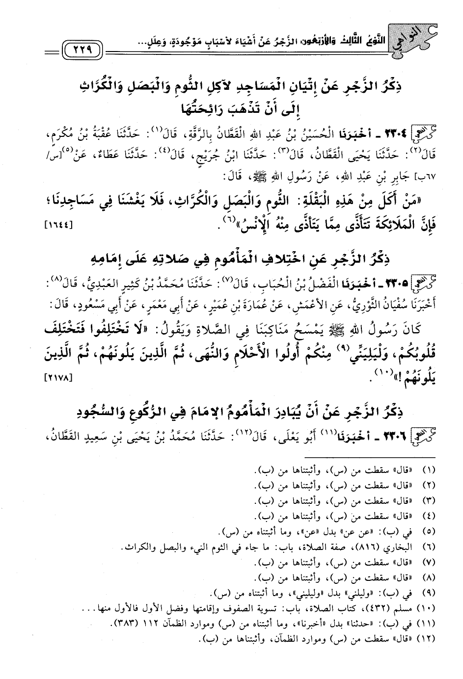 ٢٣٠٤ - أَخبَرنا الْحُسَيْنُ بْنُ عَبْدِ اللهِ الْقَطَّانُ، بِالرَّقَّةِ، قَالَ: حَدثنا عُقْبَةُ بْنُ مُكْرَمٍ، قَالَ: حَدثنا يَحْيَى الْقَطَّانُ، قَالَ: حَدثنا ابْنُ جُرَيْجٍ، قَالَ: حَدثنا عَطَاءٌ، عَنْ جَابِرِ بْنِ عَبْدِ اللهِ، عَنْ رَسُولِ اللهِ صَلى الله عَلَيه وسَلم، قَالَ: "مَنْ أَكَلَ مِنْ هَذِهِ الْبَقْلَةِ: الثُّومِ، وَالْبَصَلِ، وَالْكُرَّاثِ، فَلَا يَغْشَنَا فِي مَسَاجِدِنَا، فَإِنَّ الْمَلَائِكَةَ تَتَأَذَّى مِمَّا يَتَأَذَّى مِنْهُ الإِنْسُ". [١٦٤٤]