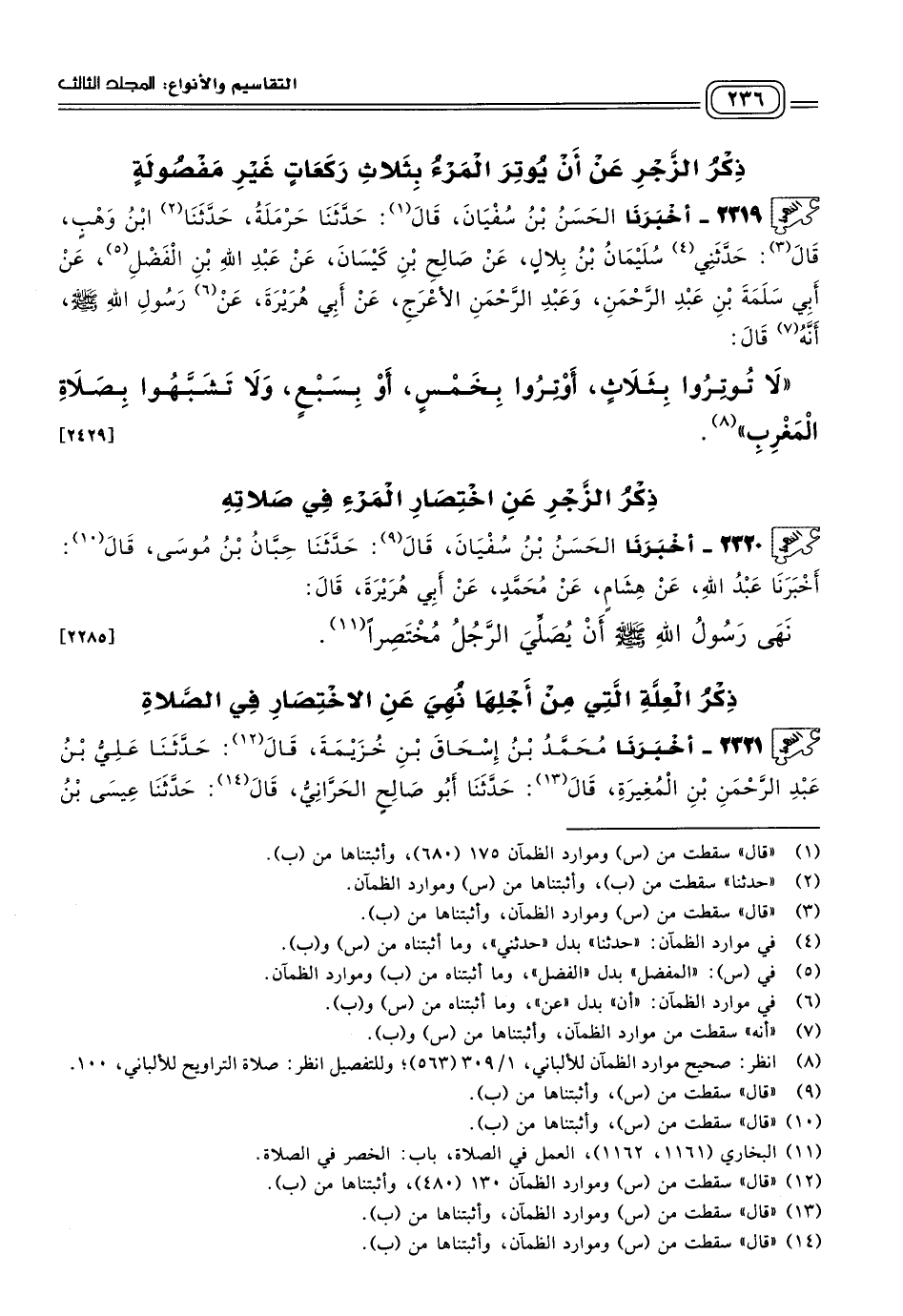 ٢٣١٩ - أَخبَرنا الْحَسَنُ بْنُ سُفْيَانَ، قَالَ: حَدثنا حَرْمَلَةُ، حَدثنا ابْنُ وَهْبٍ، قَالَ: حَدَّثَنِي سُلَيْمَانُ بْنُ بِلَالٍ، عَنْ صَالِحِ بْنِ كَيْسَانَ، عَنْ عَبْدِ اللهِ بْنِ الْفَضْلِ، عَنْ أَبِي سَلَمَةَ بْنِ عَبْدِ الرَّحْمَنِ، وَعَبْدِ الرَّحْمَنِ الأَعْرَجِ، عَنْ أَبِي هُرَيْرَةَ، عَنْ رَسُولِ اللهِ صَلى الله عَلَيه وسَلم، أَنَّهُ قَالَ: "لَا تُوتِرُوا بِثَلَاثٍ، أَوْتِرُوا بِخَمْسٍ، أَوْ بِسَبْعٍ، وَلَا تَشَبَّهُوا بِصَلَاةِ الْمَغْرِبِ". [٢٤٢٩]