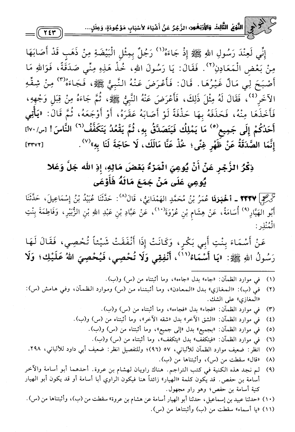 ٢٣٣٧ - أَخبَرنا عُمَرُ بْنُ مُحَمَّدٍ الْهَمْدَانِيُّ، قَالَ: حَدثنا عُبَيْدُ بْنُ إِسْمَاعِيلَ، حَدثنا أَبُو الهيار أُسَامَةُ، عَنْ هِشَامِ بْنِ عُرْوَةَ، عَنْ عَبَّادِ بْنِ عَبْدِ اللهِ بْنِ الزُّبَيْرِ، وَفَاطِمَةَ بِنْتِ الْمُنْذِرِ، عَنْ أَسْمَاءَ بِنْتِ أَبِي بَكْرٍ وَكَانَتْ إِذَا أَنْفَقَتْ شَيْئًا تُحْصِي، فَقَالَ لَهَا رَسُولُ اللهِ صَلى الله عَلَيه وسَلم: "يا أسماء، أَنْفِقِي وَلَا تُحْصِي فَيُحْصِيَ اللهُ عَلَيْكِ، وَلَا تُوعِي فَيُوعِيَ اللهُ عَلَيْكِ". [٣٢٠٩]