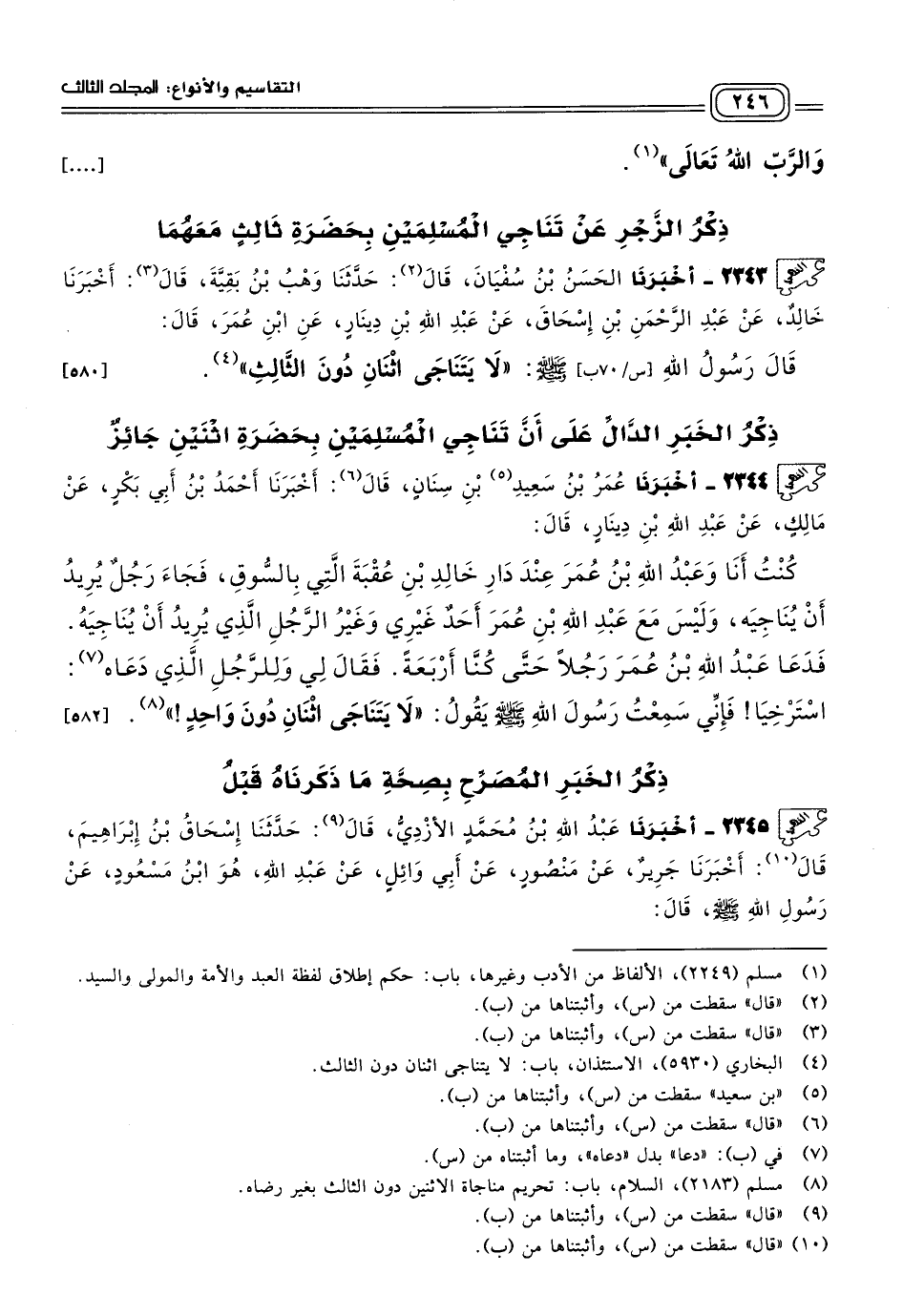 ٢٣٤٣ - أَخبَرنا الْحَسَنُ بْنُ سُفْيَانَ، قَالَ: حَدثنا وَهْبُ بْنُ بَقِيَّةَ، قَالَ: أَخبَرنا خَالِدٌ، عَنْ عَبْدِ الرَّحْمَنِ بْنِ إِسْحَاقَ، عَنْ عَبْدِ اللهِ بْنِ دِينَارٍ، عَنِ ابْنِ عُمَرَ، قَالَ: قَالَ رَسُولُ اللهِ صَلى الله عَلَيه وسَلم: "لَا يَتَنَاجَى اثْنَانِ دُونَ الثَالِثٍ". [٥٨٠]
